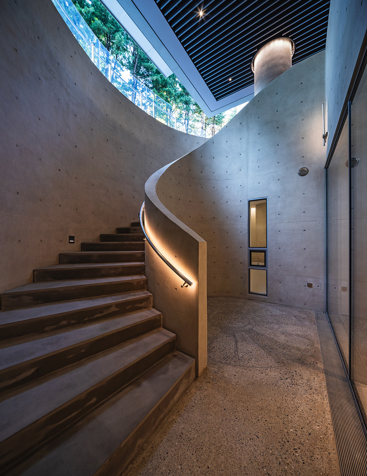 반원형 선큰_ 기계식 주차가 아닌 자주식 주차장 설치 요구에 따라 대지 중앙으로 진입로를 계획하고 지하주차장 램프로 이어지게 했다. 이로 인해 자연스럽게 반원형의 곡선 램프가 형성되었고, 이 반원형 곡면을 따라 나선형 계단을 두어 지하 1층 선큰공간과 건축주를 위한 프라이빗하고 상징적인 갤러리 출입구로 기능하게 되었다.