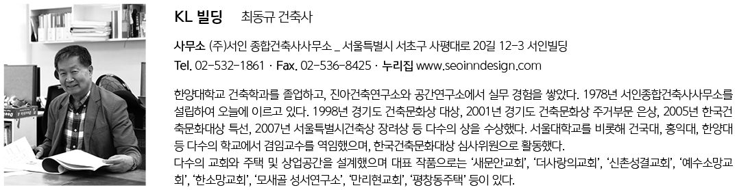 | KL 빌딩 설계자 | 최동규 · 최유철 _ (주)서인종합건축사사무소 건축주 | 케이엘 에스테이트 감리자 | (주)서인종합건축사사무소 시공사 | C건설 설계팀 | 주효진, 한혜선, 이소진, 유한성 설계의도 구현 | (주)서인 종합건축사사무소 대지위치 | 서울특별시 서초구 서초동 법원로4길 11-6 주요용도 | 업무시설(사무소) 대지면적 | 699.33㎡ / 건축면적 | 363.05㎡ 연면적 | 2,244.14㎡ / 건폐율 | 51.91% 용적률 | 177.70% / 규모 | B2F - 5F 구조 | 철근콘크리트구조 외부마감재 | 인조석타일, DK컬러강판, 로이복층유리 내부마감재 | 지정석재, 페인트, 네트워크플로어 설계기간 | 2020. 03 - 2021. 08 공사기간 | 2021. 02 – 2022. 08 사진 | 임준영 구조분야 | (주)더나은구조엔지니어링 기계설비분야 | (주)맥엔드엠이씨 전기분야 | (주)대경전기설계사무소 소방분야 | (주)맥엔드엠이씨, (주)대경전기설계사무소 경관조명분야 | 스튜디오 폼기버 인테리어분야 | (주)케이램 |
