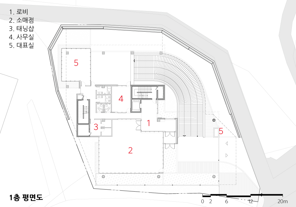 The key considerations in this plan include 1) securing an efficient construction area, considering the irregular site boundaries, 2) applying wide column spacing and high ceilings considering the specialized nature of indoor sports spaces, and 3) addressing the complex surroundings of the site surrounded by mountains, schools, and apartments. Keeping these conditions in mind, the focal points of the plan have been outlined.