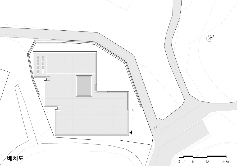 또 외장 재료는 매스의 형상을 오롯이 드러낼 수 있도록 회색 계열의 외단열 미장마감을 적용했다. 그림자에 따라 변화하는 다양한 입면의 모습을 담아낼 수 있도록 거친 재질을 사용했으며, 상대적으로 가벼운 외벽 재료의 물성으로 인해 합리적인 구조 계획이 될 수 있도록 했다.