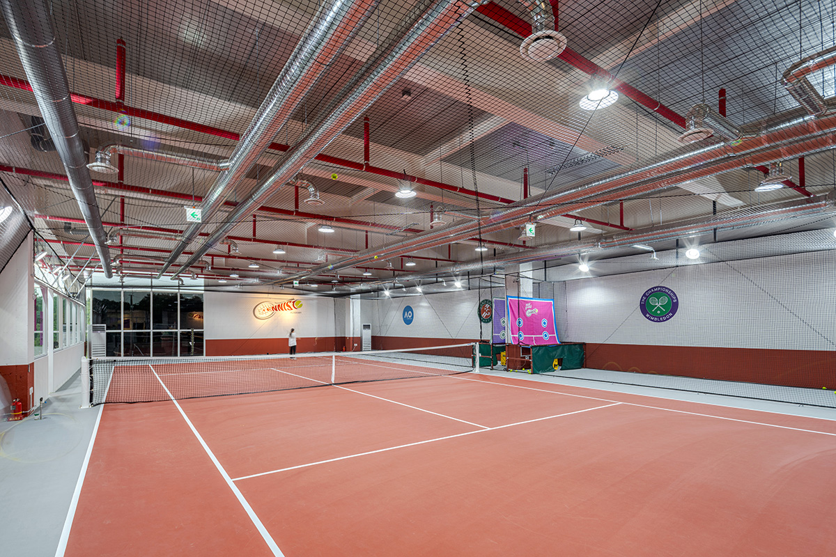 지상 2층에는 피트니스 센터가 위치한다. 이용자의 대부분이 의자에 앉아 있는 지상 1층과는 반대로, 이 공간은 쉬지 않고 움직이는 사람들로 가득한 공간이다. 하지만 지상 1층과 마찬가지로 인접 학교와의 시선 간섭을 방지하면서도 개방감 있는 실내 환경이 필요했다. 이러한 상반된 조건을 극복하기 위해 전면에는 높이 1.5미터의 소제창을 적용했다. 1층의 사람들은 주로 앉아 있기 때문에 담장을 세우고, 2층의 사람들은 주로 서 있기 때문에 낮은 창호를 계획한 것이다. 지상 3층은 풀 사이즈의 실내 테니스장을 계획했으며, 시설의 특성과 이용 편의를 고려해 전면부는 솔리드 벽체를 적용했다.