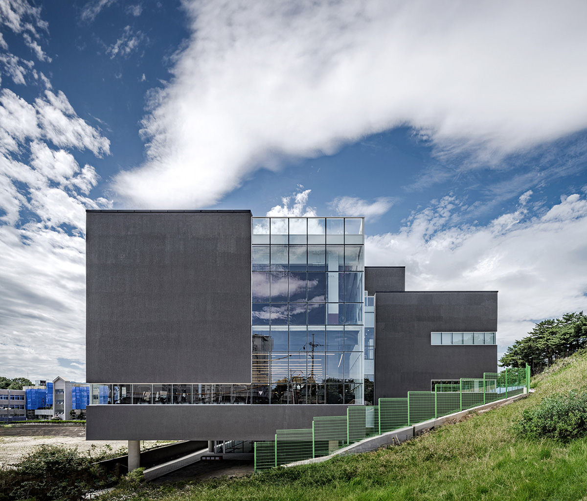 Additionally, considering height constraints due to sunlight restrictions, each floor has been planned with a ceiling height of 5.4m or more, aiming to provide optimal usability. The exterior material features a grey-toned thermal insulation finish to fully reveal the form of the masses. Utilizing rough materials to capture the varied appearances of the facade as they change with shadows, the relatively lightweight properties of the exterior wall material allow for a rational structure plan.