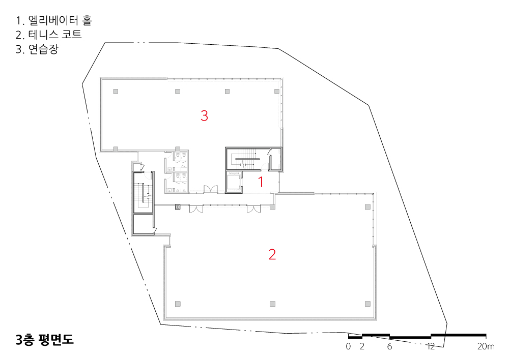 지상 2층에는 피트니스 센터가 위치한다. 이용자의 대부분이 의자에 앉아 있는 지상 1층과는 반대로, 이 공간은 쉬지 않고 움직이는 사람들로 가득한 공간이다. 하지만 지상 1층과 마찬가지로 인접 학교와의 시선 간섭을 방지하면서도 개방감 있는 실내 환경이 필요했다. 이러한 상반된 조건을 극복하기 위해 전면에는 높이 1.5미터의 소제창을 적용했다. 1층의 사람들은 주로 앉아 있기 때문에 담장을 세우고, 2층의 사람들은 주로 서 있기 때문에 낮은 창호를 계획한 것이다. 지상 3층은 풀 사이즈의 실내 테니스장을 계획했으며, 시설의 특성과 이용 편의를 고려해 전면부는 솔리드 벽체를 적용했다.