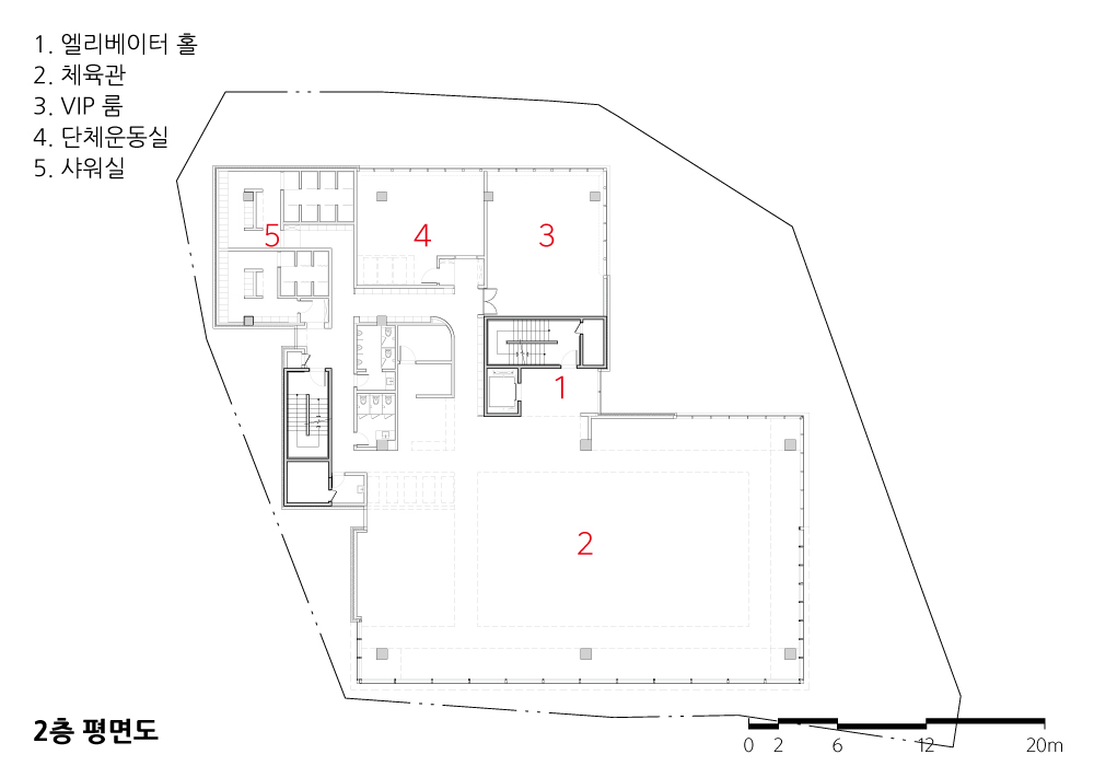본 계획에서 해결해야 하는 주요 조건들은 ▲비정형의 대지경계선을 고려한 효율적인 건축 영역 확보 ▲실내 스포츠 공간이라는 프로그램의 특수성을 고려한 넓은 기둥 간격 및 높은 층고의 적용 ▲산지와 학교 및 아파트로 둘러싸여 있는 복합적인 대지의 주변 환경이었으며, 해당 조건들을 고려하여 계획의 주안점을 정리했다.