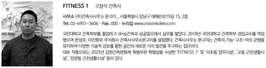 | FITNESS 1 설계자 | 고정석 _ (주)건축사사무소 문고리 건축주 | FITNESS 1 감리자 | (주)건축사사무소 문고리 설계팀 | 문성우, 이진화, 김지원 대지위치 | 강원특별자치도 강릉시 화부산로91번길 21 주요용도 | 근린생활시설 대지면적 | 1,686.33㎡ 건축면적 | 990.17㎡ 연면적 | 3,678.76㎡ 건폐율 | 58.72% 용적률 | 157.87% 규모 | B1F - 3F 구조 | 철골철근콘크리트, 철근콘크리트 외부마감재 | 외단열 미장마감, 로이복층유리 내부마감재 | 석고보드 위 수성페인트 설계기간 | 2022. 06 - 2022. 09 공사기간 | 2022. 09 - 2023. 07 사진 | 김진철 _ 아키프레소 구조분야 | 주식회사 중앙탑 기계설비·전기·소방분야 | (주)코담기술단 |