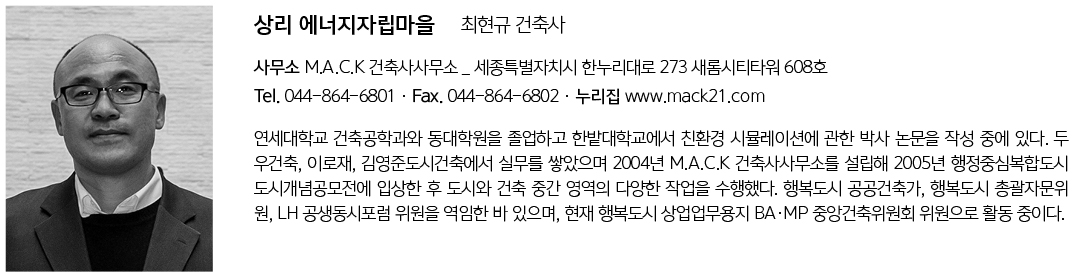 | 상리 에너지자립마을 설계자 | 최현규 _ M.A.C.K 건축사사무소 건축주 | 세종특별자치시청 감리자 | M.A.C.K 건축사사무소 시공사 | 세운종합건설(주), 에스케이솔라에너지(BIPV) 설계팀 | 임우석, 이원호, 남동훈, 박영철 설계의도 구현 | MACK 건축사사무소 대지위치 | 세종특별자치시 조치원읍 터미널안길 12·13 주요용도 | 공동주택 대지면적 | 1,454㎡(본동)/477㎡(별동) 건축면적 | 552㎡(본동)/211㎡(별동) 연면적 | 1,854㎡(본동)/428㎡(별동) 건폐율 | 38%(본동)/44%(별동) 용적률 | 127%(본동)/90%(별동) 규모 | 5F(본동)/3F(별동) 구조 | 철근콘크리트구조 외부마감재 | 화이트 징크, 청고벽돌 내부마감재 | 친환경수성페인트, 테라죠타일, 륨카펫 설계기간 | 2021. 06 - 2022. 04 공사기간 | 2021. 12 - 2023. 11 사진 | 최현규 구조분야 | (주)시엘에스이엔지 기계설비분야 | 미래ENG 전기분야 | 미래ENG 소방분야 | 미래ENG 에너지컨설팅 | (주)네드 |