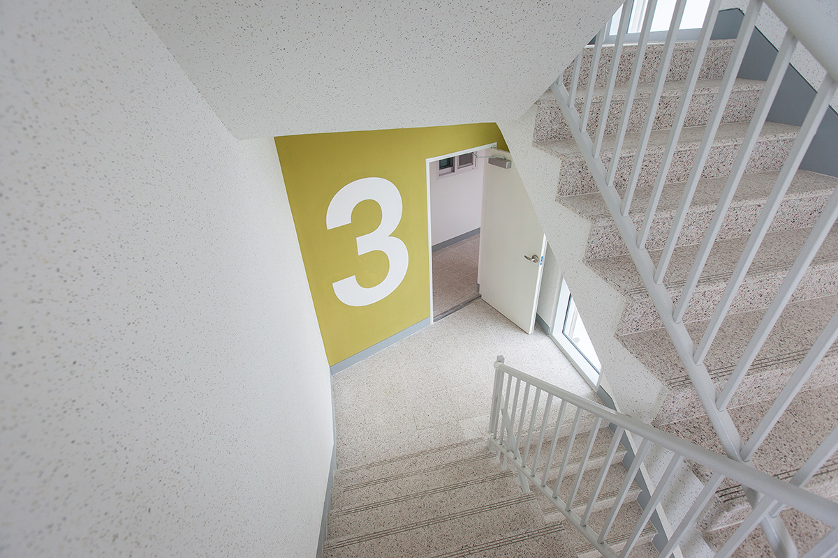 Landscape-wise, the massing was segmented to harmonize with the urban regeneration area around Jocheon Bridge, and outdoor terrace spaces were provided to mitigate the scale of the 5-story structure’s impact on neighboring single-family home sites. Exterior materials include color BIPV, white zinc, and blue bricks.