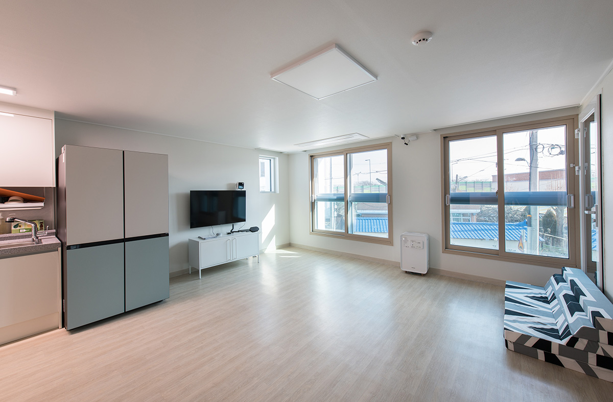 The Sangri Eco-Energy Self-Sufficient Village has realized a 5-story mid-rise multi-family housing as a zero energy Grade 3 building. Through shading analysis, color BIPV was installed on the east-west facing walls to maximize solar energy utilization. In addition to wall BIPV, roof BIPV and Building Energy Management Systems (BEMS) were implemented, along with eco-friendly technologies such as vacuum insulation panels, high-performance aluminum window frames, and small wind turbines. Furthermore, a Living Lab was established on the 2nd floor of the main building, allowing residents to experience smart zero-energy technologies such as Smart Walls and Smart Windows in their daily lives.
