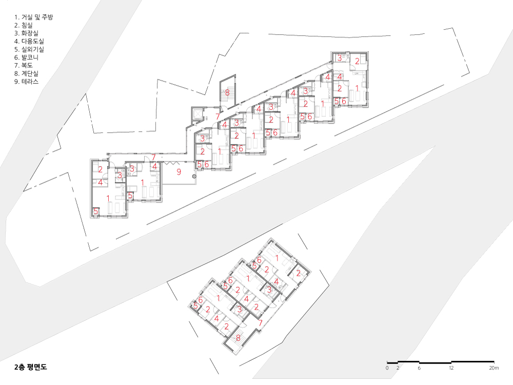 Sangri Energy independent housing Architect | Choi, HyunKyu _ MACK Architect’s Office Client | Sejong City Government Supervisor | M.A.C.K Architectural Office Construction | Sewoon Construction Co. /SKSE(Bipv) Project team | Lim, Wooseok / Lee, Wonho / Nam, Donghun / Park, Myungcheol Design intention realization | M.A.C.K Architectural Office Location | 12·13, Terminalan-gil, Jochiwon-eup, Sejong-si, Korea Program | Apartment house Site area | 1,454㎡(A)/477㎡(B) Building area | 552㎡(A)/211㎡(B) Gross floor area | 1,854㎡(A)/428㎡(B) Building to land ratio | 38%(A)/44%(B) Floor area ratio | 127%(A)/90%(B) Building scope | 5F(A)/3F(B) Structure | RC Exterior finishing | Whit zinc panel, Bricks Interior finishing | Vinyl tiles, Terrazo finishing, Water paint Design period | Jun. 2021 - Apr. 2022 Construction period | Dec. 2021 - Nov. 2023 Photograph | Choi, HyunKyu Structural engineer | CLS Structural ENG Mechanical engineer | Mirae ENG Electrical engineer | Mirae ENG Fire engineer | Mirae ENG Energy Consulting | NED |