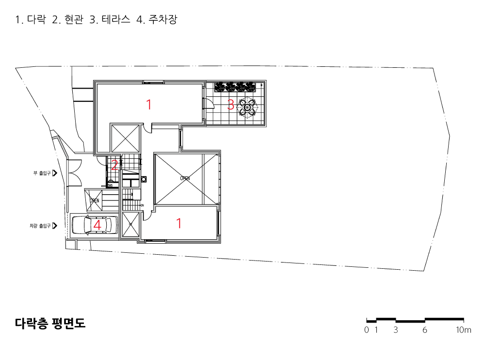 주방 옆 보조주방을 통해 밖으로 나가면 브리지 넘어 텃밭을 두어 전원주택의 느낌을 주었다. 지구단위계획에 의한 경사 지붕엔 다락방이 있고, 다락방 앞에도 조그만 테라스를 두어 각 층마다 외부 공간을 구성했다.