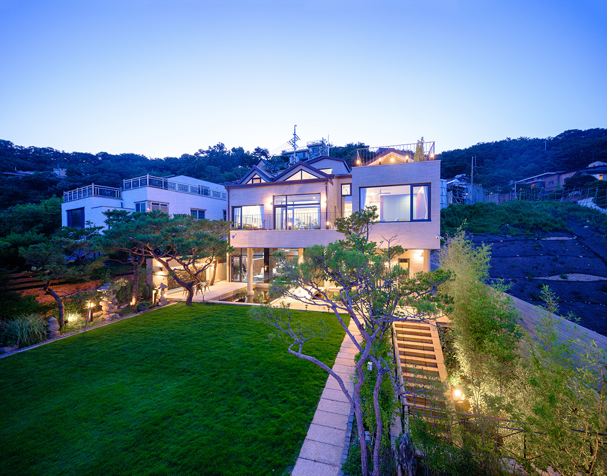 대문을 열고 들어서면 계단 옆으로 대나무 숲이 넓게 펼쳐져 있고, 그 밑으로 다양한 화초들이 꽃을 피워 계단이라는 경사의 부담을 잊게 한다. 어느새 계단을 다 오르면 넓은 잔디마당 주변으로 소나무를 비롯한 수공간, 수벽과 조경이 계절별 테마로 자리한 듯 조화롭다. 쓱 돌아보면 언뜻 보이는 석탑이 옷깃을 여미게 한다. 수공간의 분수가 큰소리를 내고, 브릿지 건너 1층 현관에 들어서서 비치 의자에 앉으면 대형 창을 통해 보이는 수공간과 잔디마당 주변의 억새밭은 깊은 산속 힐링의 장소가 된다. 마당에서 다락 층까지 각기 다른 분위기의 테라스는 비 오는 날 와인을 한 잔 마시며 잔뜩 분위기를 내도 좋을 듯하다.