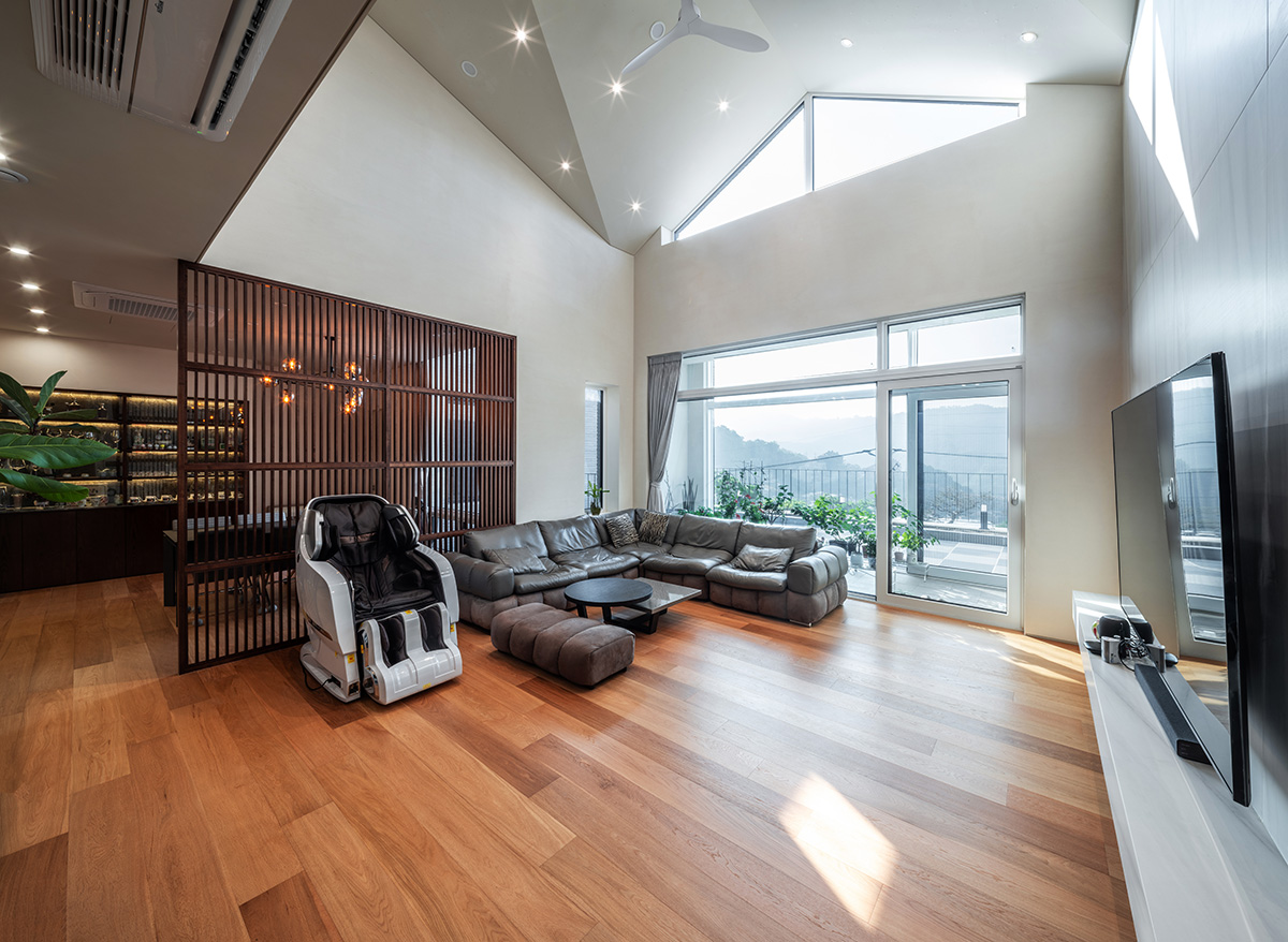 Upon opening the main door, a wide bamboo forest spreads beside the stairs, and beneath it, various flowers bloom, alleviating the slope’s burden. Upon reaching the top of the stairs, the expansive lawn surrounding the lawn, including pine trees, along with various spaces, retaining walls, and landscaping, harmoniously themed by season, is serene. Turning around, a stone pagoda catches the eye. The fountain in the outdoor space emits a loud sound, and sitting on the beach chair in front of the 1st floor entrance, the outdoor space and the grassy lawn surrounding it through the large window become a healing place deep in the mountains. The terraces from the courtyard to the attic floor each have a different atmosphere, making them perfect for enjoying a glass of wine on rainy days.