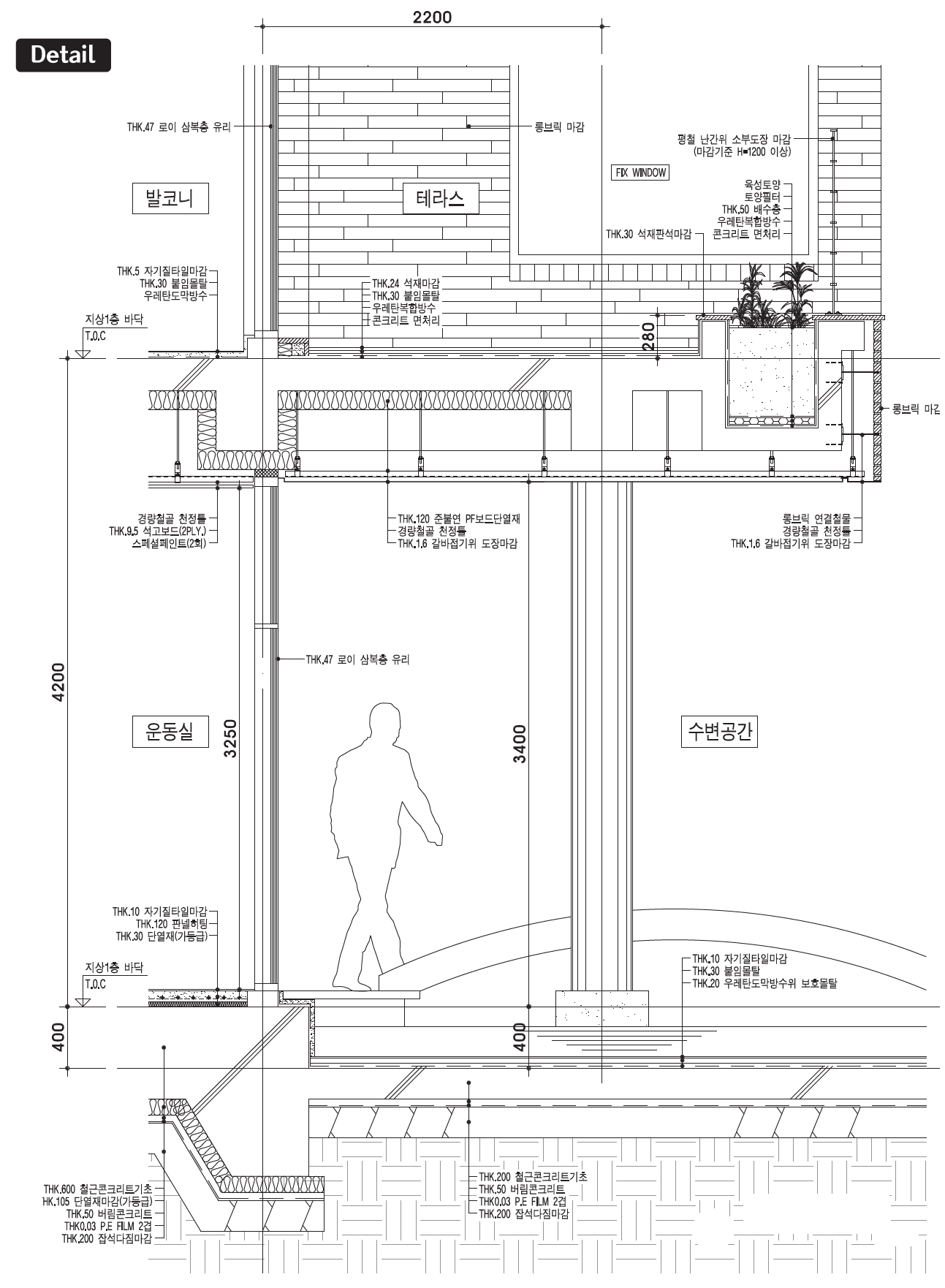 입면, 단면, 주차는 다소 부담될 수 있는 매스 중간에 중정을 두어 분절함으로써 시각적 편안함을 주었다. 또 외장재는 롱브릭을 사용해 주변 건축물들과 어울리도록 구성했으며, 실용성 있는 창호 계획으로 건축주의 의견을 반영했다. 남쪽의 낮은 도로에 4대의 주차가 가능하도록 하여 방문자를 배려했고, 그 위로는 마당을 형성하여 건물 현관과 연계하고 북쪽의 높은 도로에서도 주차가 가능하도록 했다. 더해 주차 후에 바로 단차 없이 건물에 진입이 가능하도록 단면을 계획하여 노년에 엘리베이터를 설치하여 편하게 사용할 수 있도록 했다.