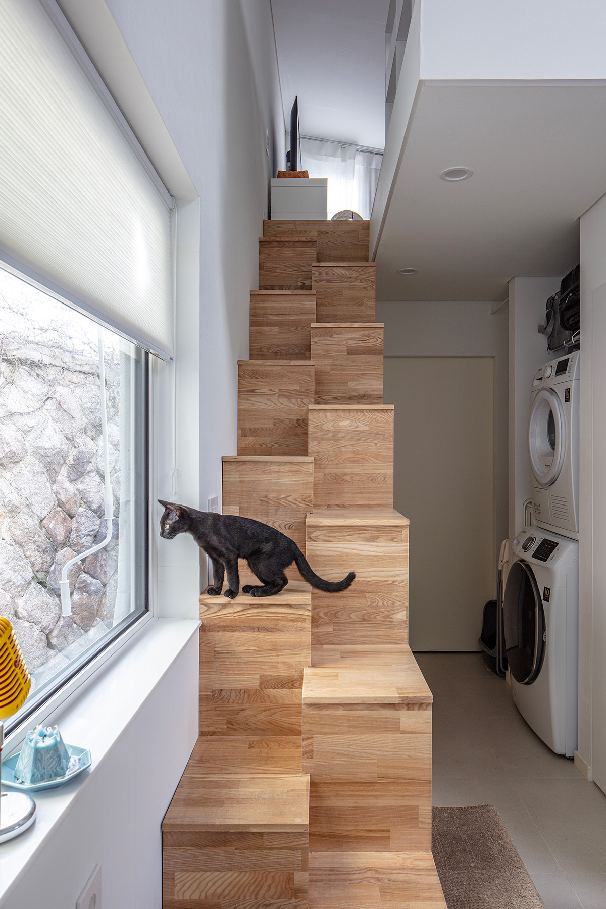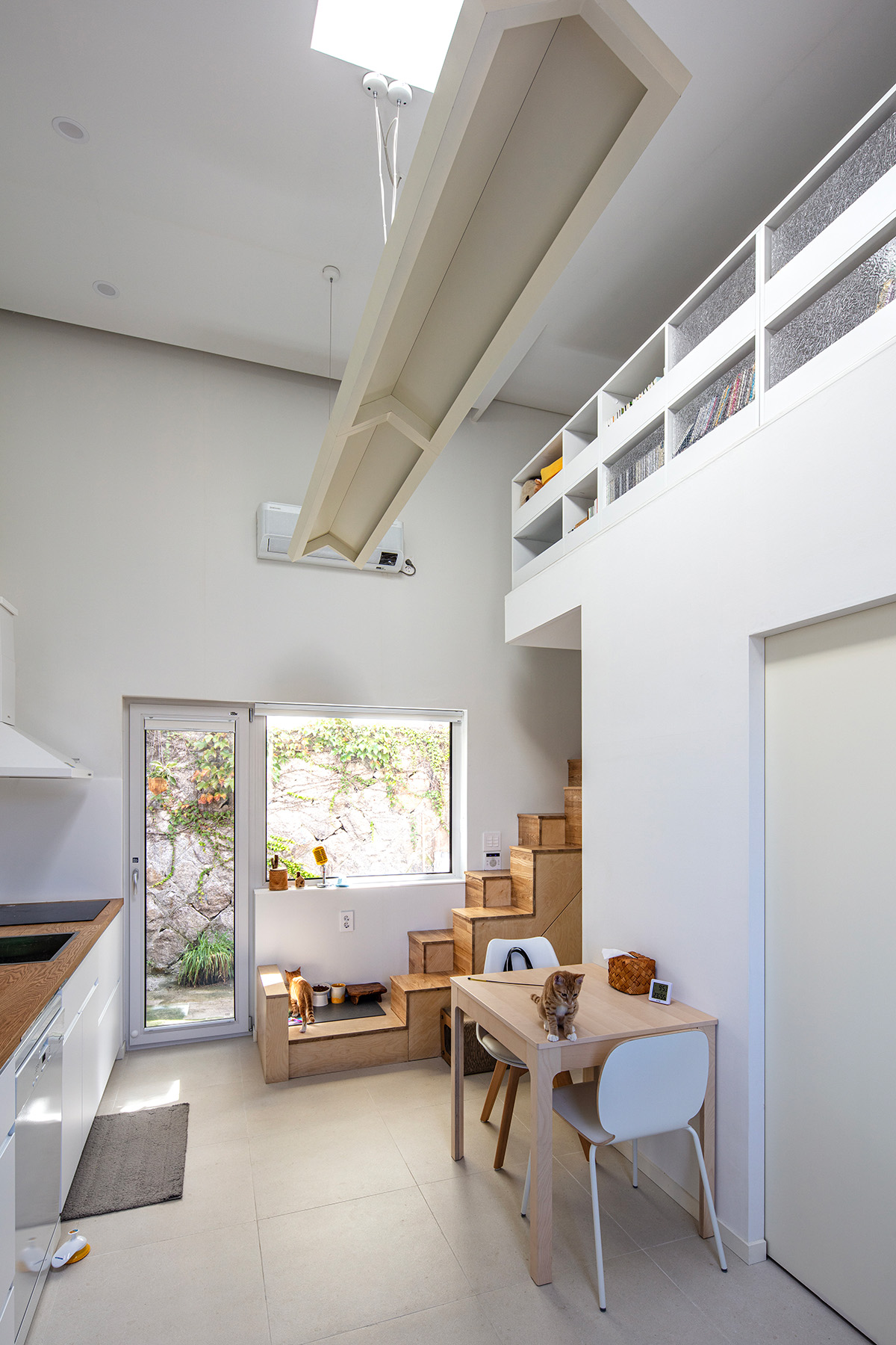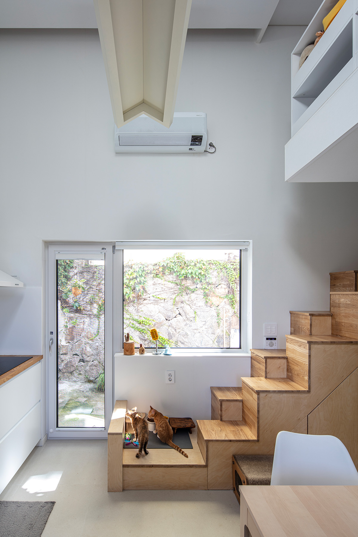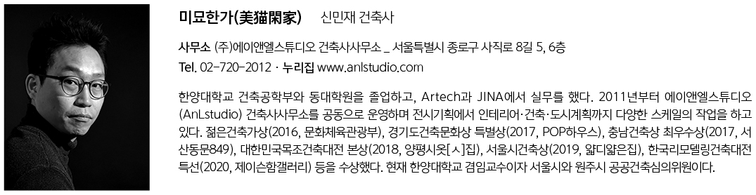 | 미묘한가(美猫閑家) 설계자 | 신민재 _ (주)에이앤엘스튜디오 건축사사무소 건축주 | 이대기 감리자 | 공사감리 제외 대상 시공사 | 건축주 직영 설계팀 | 안기현(한양대학교 교수), 허훈, 심수진 대지위치 | 서울특별시 성북구 성북로16가길 5 주요용도 | 단독주택 대지면적 | 53.00㎡ 건축면적 | 30.02㎡ 연면적 | 30.02㎡ 건폐율 | 56.64% 용적률 | 56.64% 규모 | 1F 구조 | 목구조 외부마감재 | 외벽 _ 테라코 플랙시택스 노말 / 지붕 _ 거멀접기, 럭스틸 PC11D 내부마감재 | 벽, 천장 _ 서울벽지 지정PVC벽지 마감 / 바닥 – 2L컴퍼니 지정 자기질 타일 다락 바닥·벽·천장 _ 구정 강마루 캐네디언 메이플 욕실 및 주방 타일 _ 욕조 : 2L컴퍼니 지정 모자이크 타일 / 바닥+벽 : 2L컴퍼니 지정 자기질 타일 설계기간 | 2021. 01 - 2021. 06 공사기간 | 2021. 08 - 2022. 01 사진 | 진효숙 |