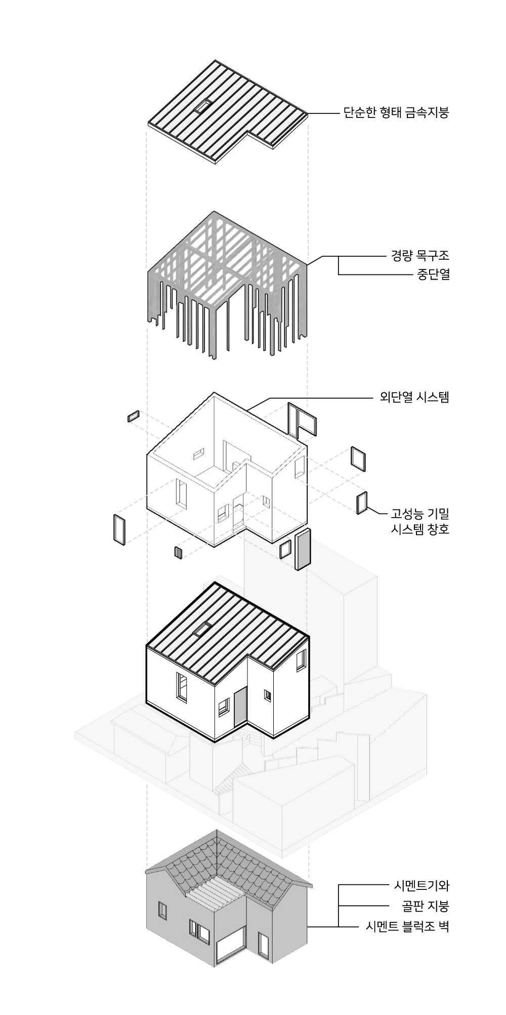 30제곱미터 남짓한 작은 집이지만, 아파트와 다세대(다가구)로 양극화된 시대에서 다양한 주거공간의 제공이라는 의미는 결코 작지만은 않을 것이다. 신축이 불가한 조건에서 대수선을 통해 현대적 삶을 담은 대안 주거의 스펙트럼에 색을 하나 추가하고자 했다.