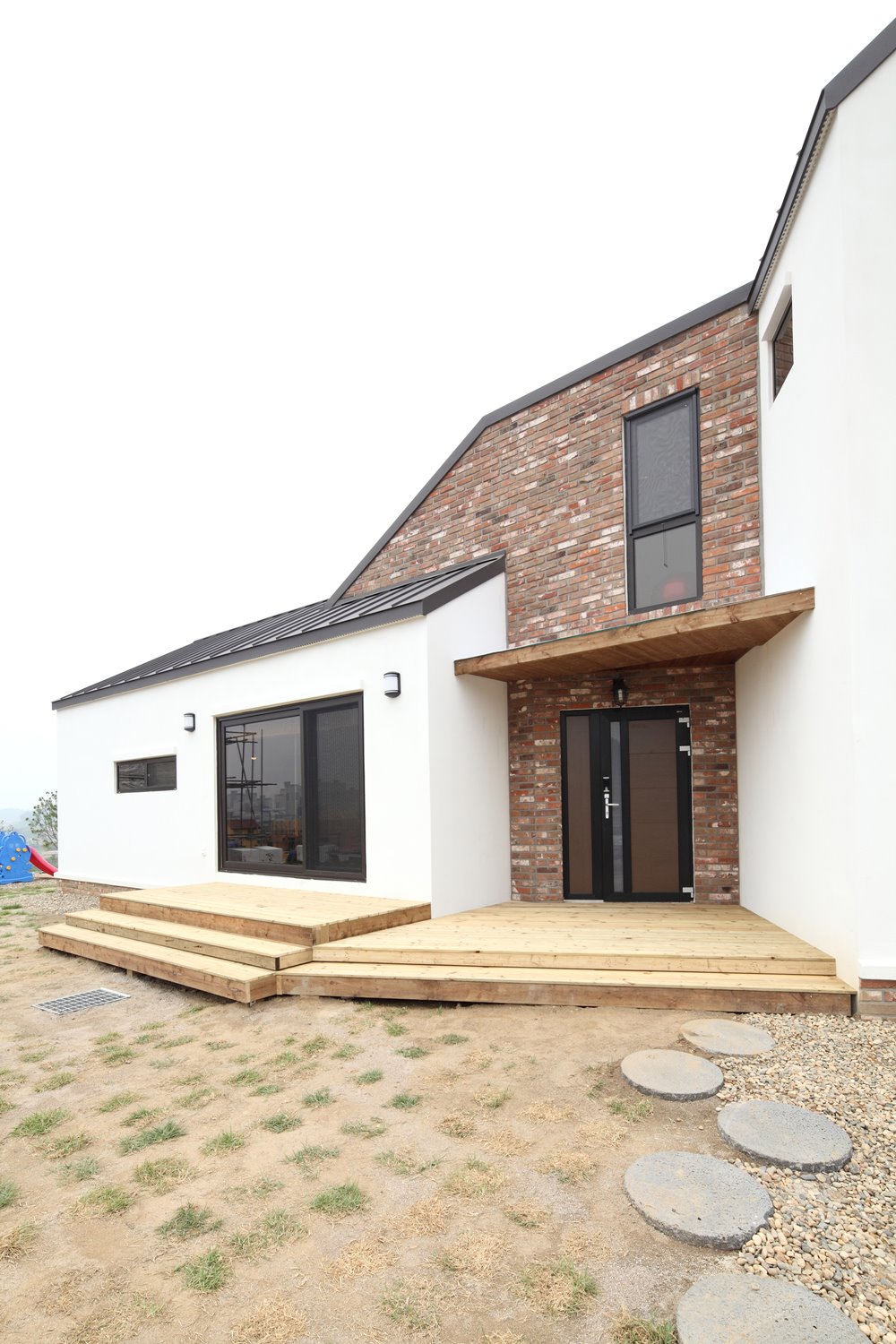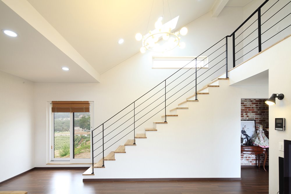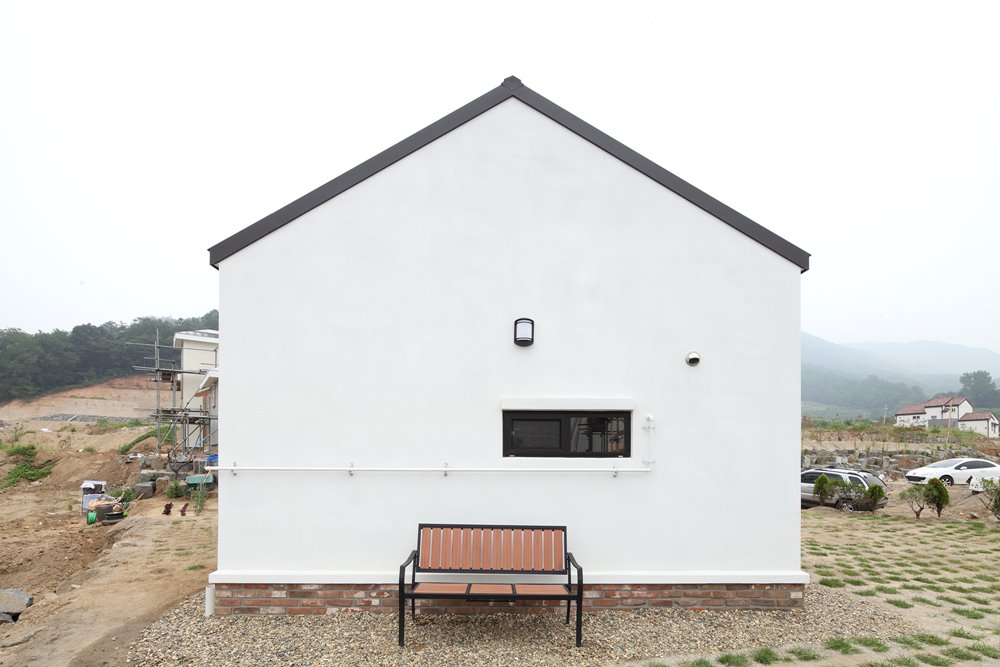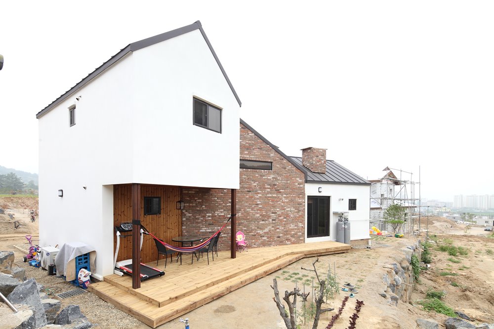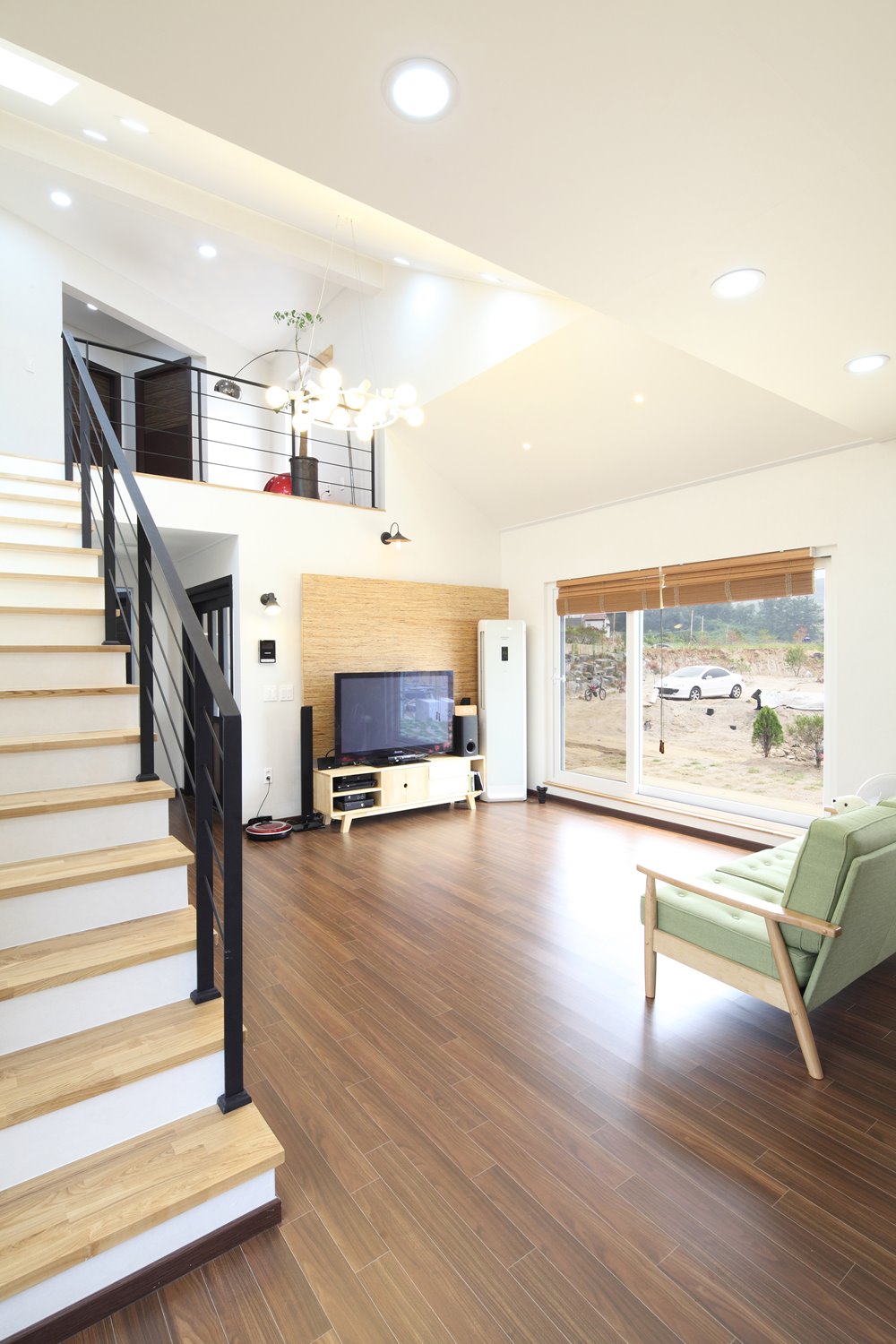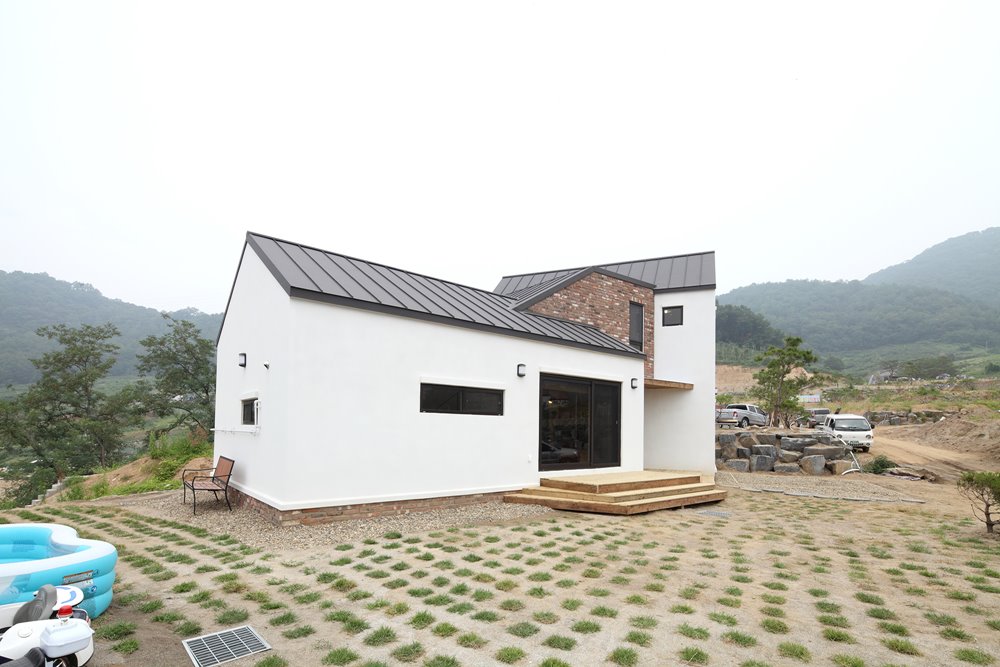 The living room, which was arranged in the full-south direction, was able to allow people to go out to the yard through the deck. In order to overcome the floor plan configuration with a small area, a deck was installed to expand the space from the inside to the outside space. The open spaces on the first and second floors were designed to reduce the volume of heating and cooling by opening a part of the living room to enhance energy efficiency, and the roof line was designed to be able to assimilate with the surrounding environment alongside the terrain line.
