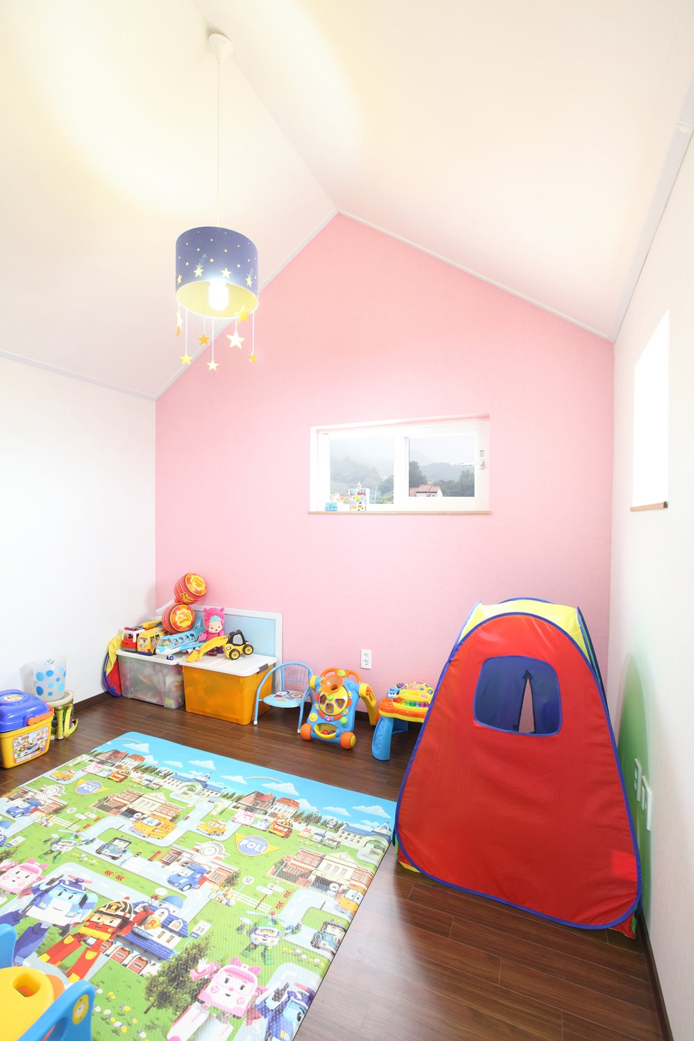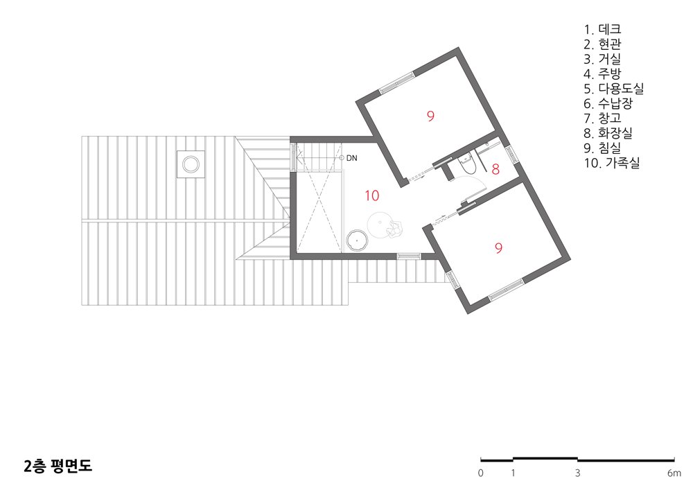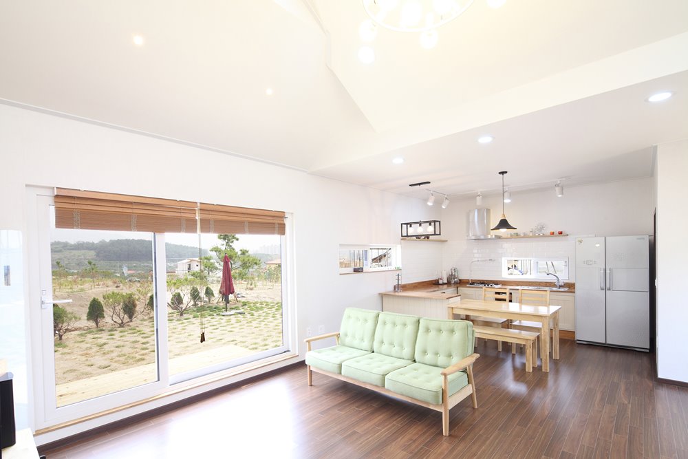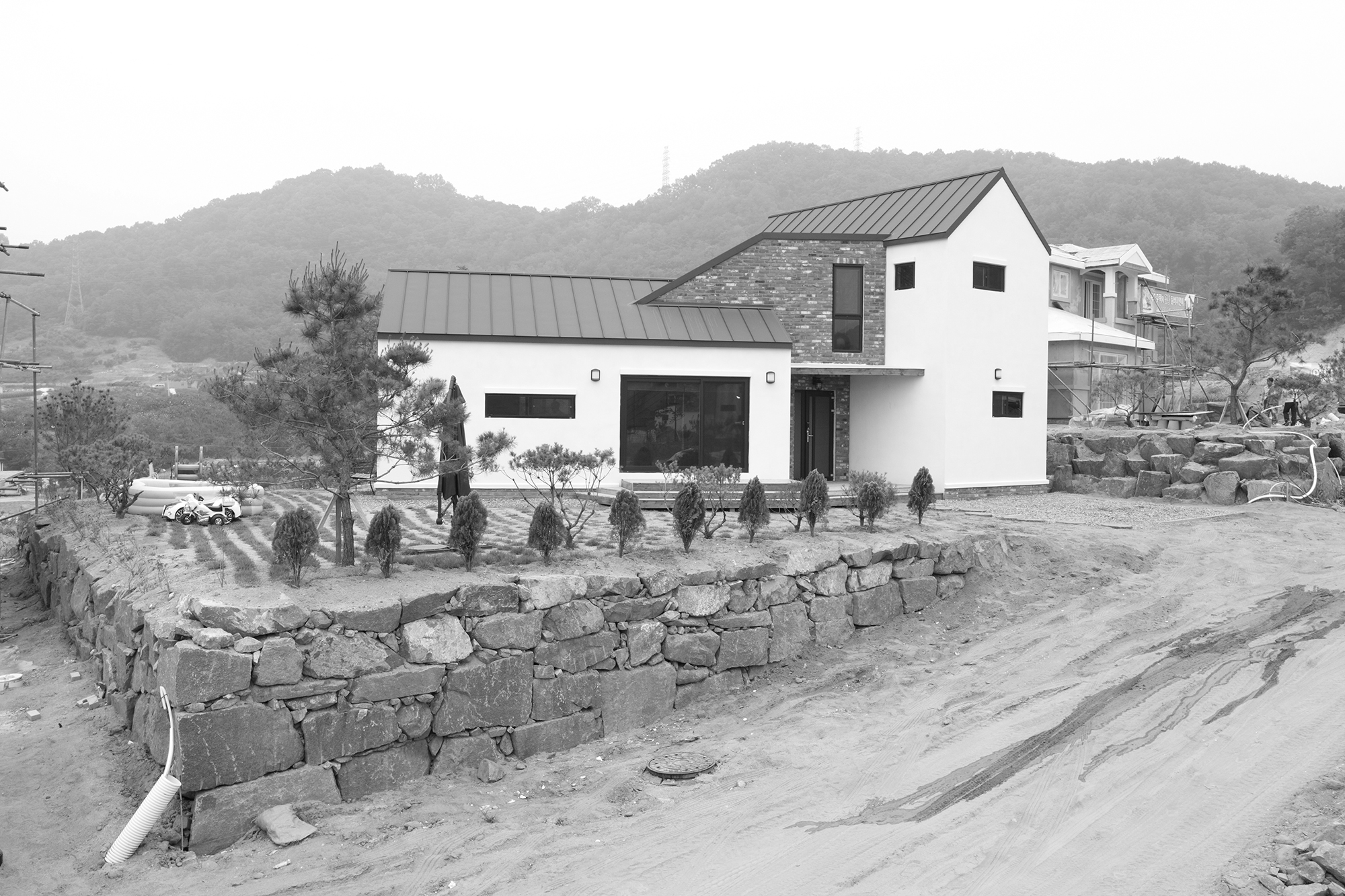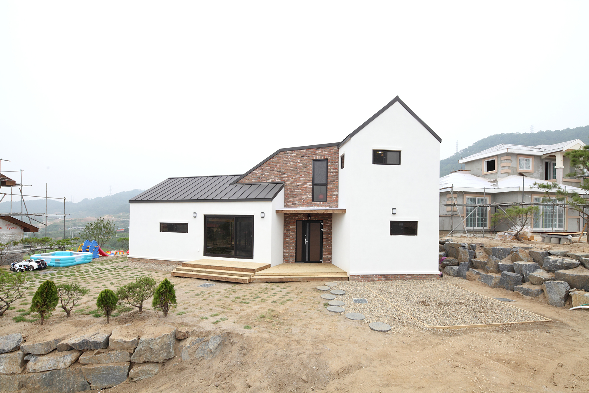 The living room, which was arranged in the full-south direction, was able to allow people to go out to the yard through the deck. In order to overcome the floor plan configuration with a small area, a deck was installed to expand the space from the inside to the outside space. The open spaces on the first and second floors were designed to reduce the volume of heating and cooling by opening a part of the living room to enhance energy efficiency, and the roof line was designed to be able to assimilate with the surrounding environment alongside the terrain line.