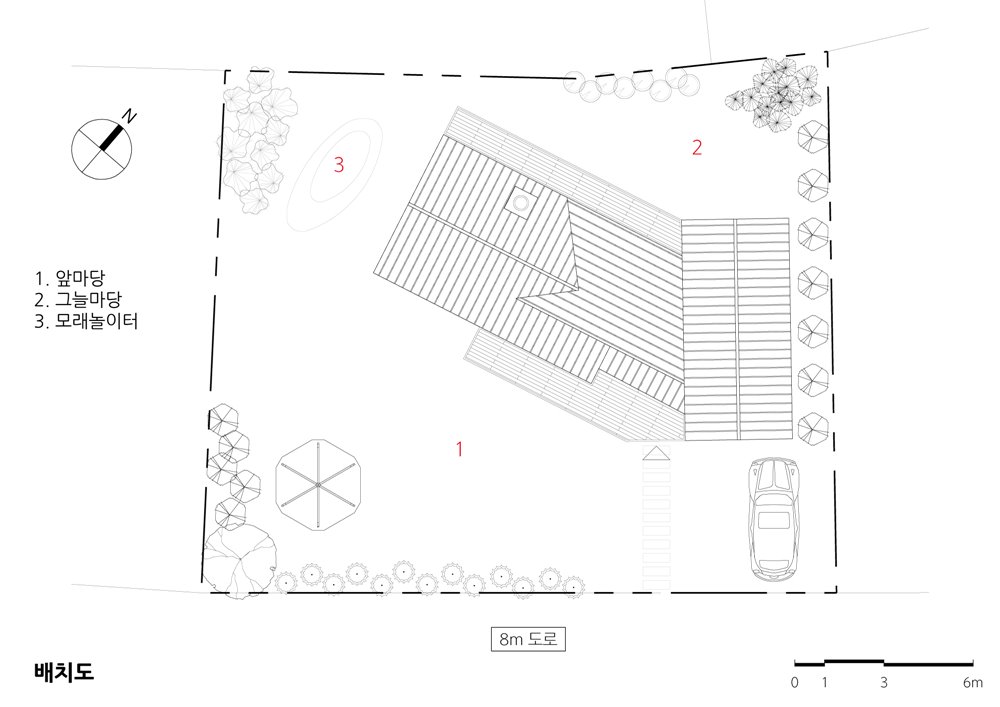 배치계획은 도로축과 향축을 고려하여 주 매스의 방향을 정남향으로 틀어 따듯한 햇살을 최대한 끌어들였다. 앞마당은 개방감을, 뒷마당은 건축물이 감싸는 그늘마당이 되도록 했다. 아늑하게 조성된 뒷마당은 그늘이 있는 필로티와 데크를 따라 이어져 아이들의 모래놀이터를 계획했다. 소박하고 소중한 추억이 생겨날 장소이다.