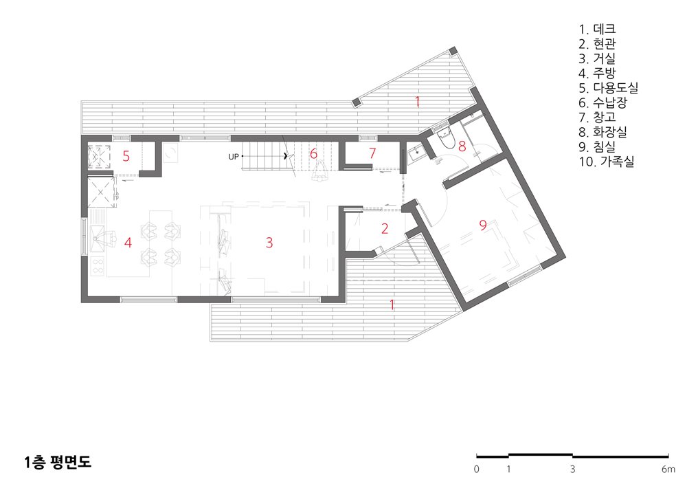 정남향으로 배치되어진 거실은 데크를 통하여 마당으로 나갈 수 있게 했다. 면적이 적은 평면구성을 극복하고자 데크를 설치하여 내부를 공간을 외부공간으로 확장한 것이다. 1,2층 오픈공간은 에너지 효율을 높이고자 거실 일부만을 오픈하여 개방감을 부여하되 냉난방 하는 체적을 줄이고자 했고 그에 따은 지붕선은 지형의 선과 나란히 하여 주변 환경과 동화될 수 있는 디자인으로 구성했다.