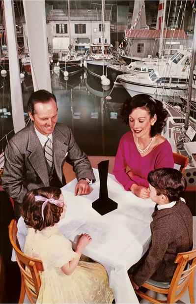 힙노시스가 디자인한 레드 제플린의 <프리센스(presence)>는 그런 접근으로 성공한 대표적인 사례다.<사진 6> 이 앨범 커버를 보면, 한 가족이 테이블에 둘러앉아 있고 테이블 위에는 검정색의 작은 물체가 놓여 있다. 정교하게 조각되어 신비로운 기운이 느껴지는 이 물체에 사람들은 주목하지 않을 수 없다. 이 물체가 이 앨범의 주제나 레드 제플린이라는 밴드와 무슨 관계가 있을까? 밴드나 디자이너 모두 특정한 상징을 말하지 않는다. 관객이 그것을 자기 멋대로 상상하고 해석하면 그만이다. 너무나 평범해 보이는 사진을 호기심의 대상으로 만드는 건 바로 그 검은색 물체다. 해서웨이 셔츠 광고 모델의 안대 같은 것이다.