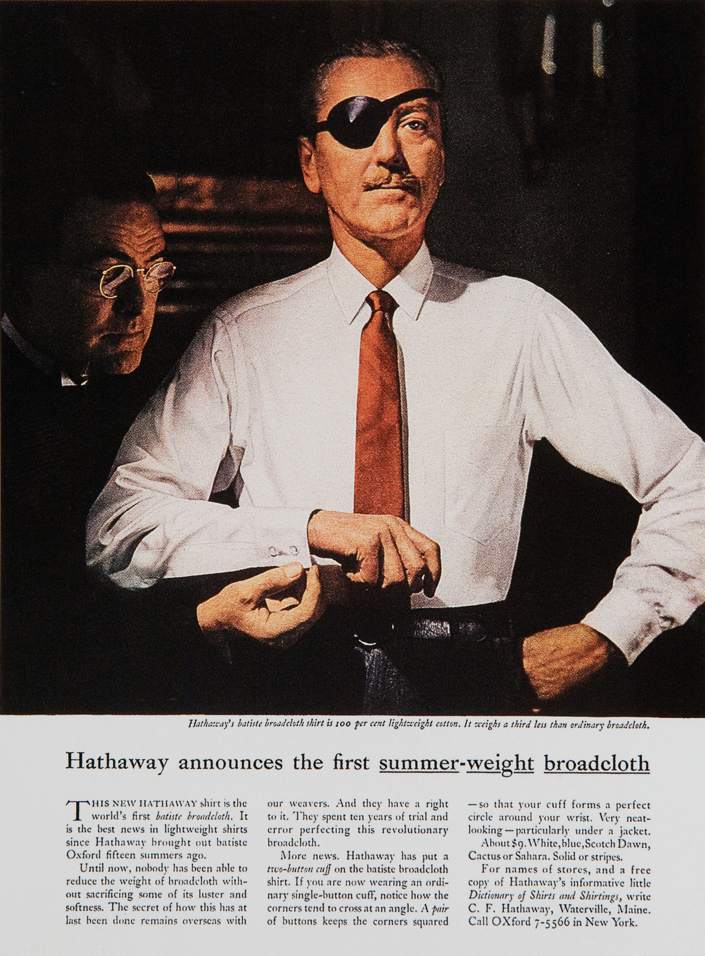 이런 기법은 앨범의 내용을 축약하거나 상징한다기보다 강력한 호기심을 불러일으키려는 의도가 더 강하다. 이는 미국의 전설적인 광고인 데이비드 오길비가 만든 해서웨이 셔츠 광고를 연상시킨다.<사진 5> 이 광고에는 애꾸눈 안대를 한 남자가 등장한다. 옆에서 재단사가 몸의 수치를 재는 동안 한쪽 팔을 허리에 댐으로써 위풍당당한 자세를 취한 이 남자는 왠지 상류사회의 일원으로 보인다. 이 이미지는 보는 사람들은 누구나 본능적으로 이 남자가 무슨 연유로 한쪽 눈을 잃었을까? 하고 궁금해한다. 그러면서 광고의 카피를 읽게 되는데, 그 문장에는 이 사람이 누구이며 왜 애꾸눈 안대를 하게 되었는지 어떠한 단서도 없다. 그저 해서웨이 셔츠에 대한 내용뿐이다. 소비자의 눈을 사로잡고 카피를 읽게 만든 것만으로 이미지는 자기 구실을 100% 이상 한 것이다. 실제로 해서웨이 셔츠 회사는 이 광고로 엄청난 상업적 성공을 거두었다. 이 광고를 제작한 오길비는 이런 접근을 ‘스토리 어필(story appeal)’이라고 불렀다. 사람들은 이야기를 좋아하고, 이야기는 아주 힘이 세다.