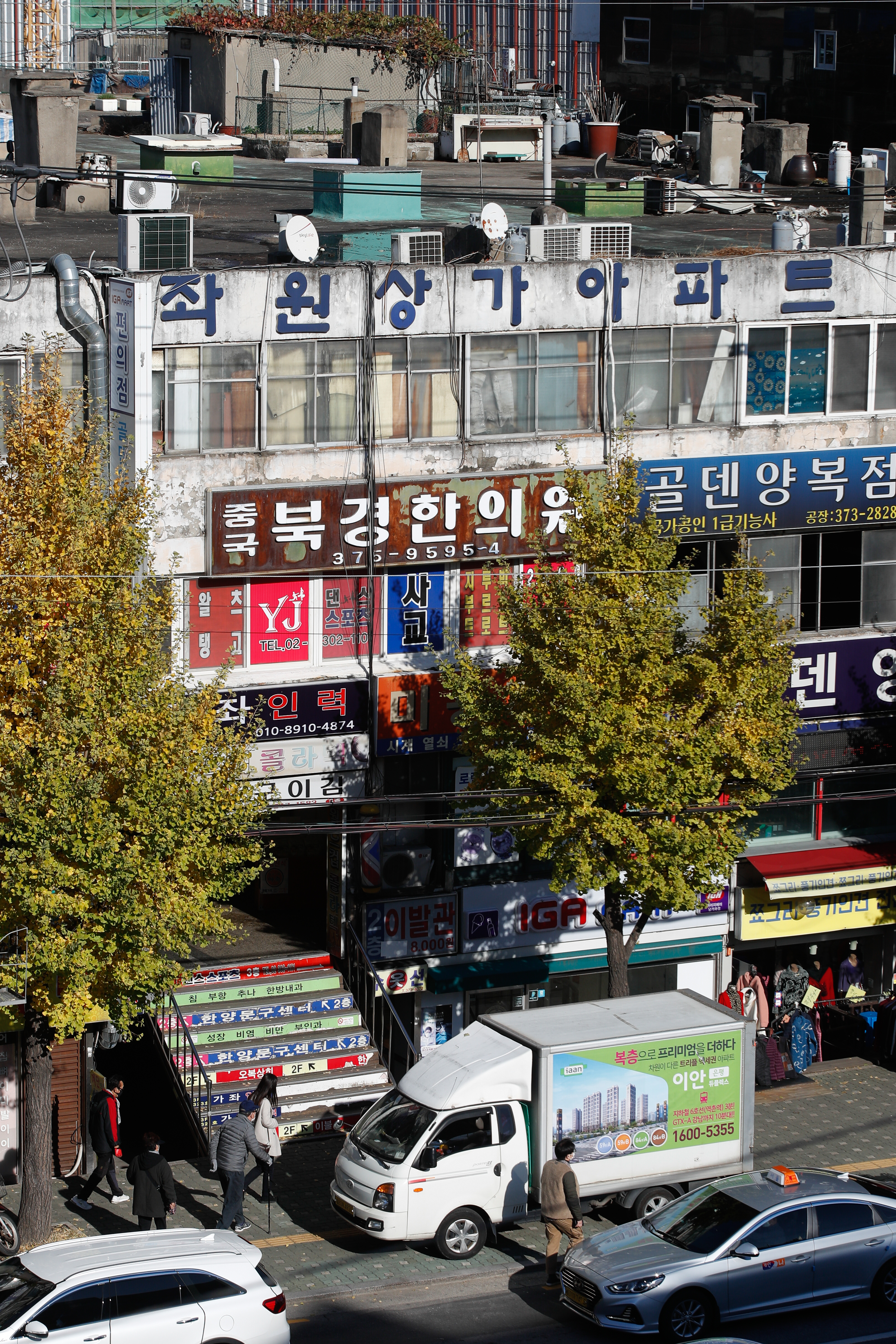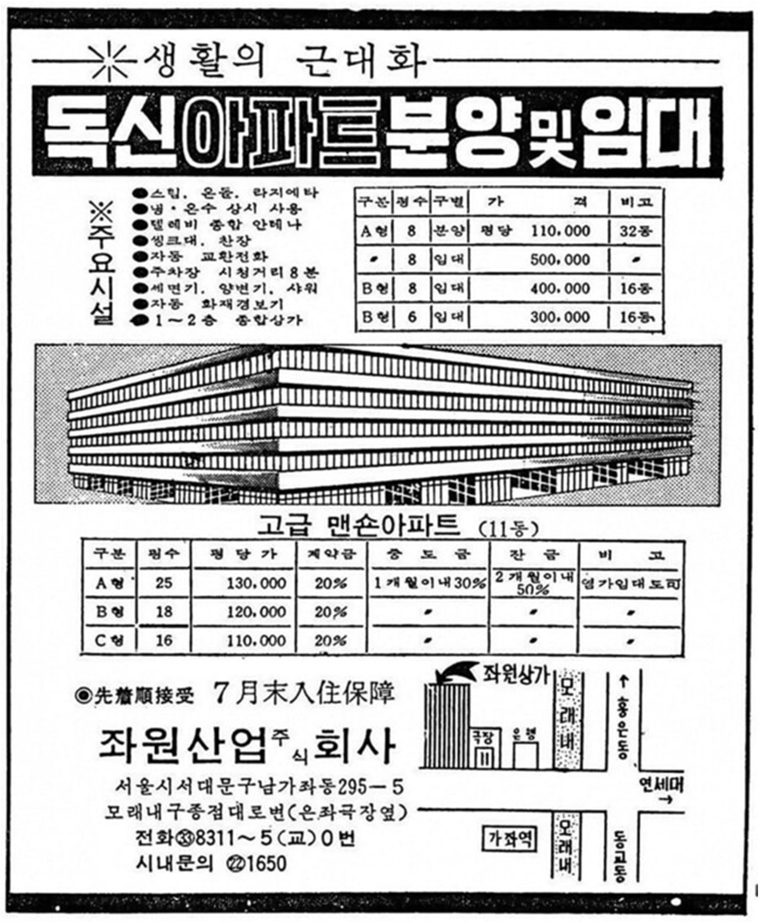 좌원상가아파트 분양 당시의 모습은 신문광고에서 확인할 수 있다. 약 20에서 27제곱미터(6~8평) 사이의 작은 아파트라서 그랬는지 독신아파트로 자리매김해서 신문광고를 내고 있다. 세면기와 양변기가 자랑거리이고 텔레비전 안테나가 특별한 것이었던 시절이 겨우 50여 년 전이라는 사실이 비현실적으로 느껴진다. 게다가 좌원상가아파는 2020년 안전 등급 E를 받아 철거와 재개발이 예정된 후에도 아직 그 자리에서 상가와 주거공간의 역할을 하고 있다.