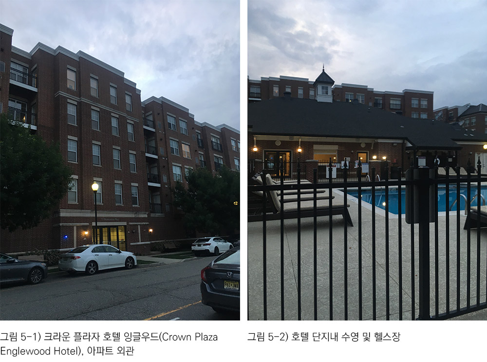 호텔체크인 _ 크라운 플라자 호텔 잉글우드(Crowne Plaza Englewood Hotel) 뉴저지에 위치한 깔끔한 호텔이다. 맨하탄 중심에서 차로 20분 정도 거리에 있다. 호텔 주 변에 쇼핑이나 카페 식당을 찾아볼 수는 없지만 호텔 뒤 저층 아파트 단지가 있어 건축을 하는 입장에서 한번은 들러봄직하다. 뉴욕 중심부가 아니라고 얕잡아 보기에는 꽤 훌륭 한 주거환경을 갖추고 있다. 저녁에 강아지와 산책하고, 푸른 잔디의 벤치에서 책 읽는 여 유로움을 느낄 수 있다.