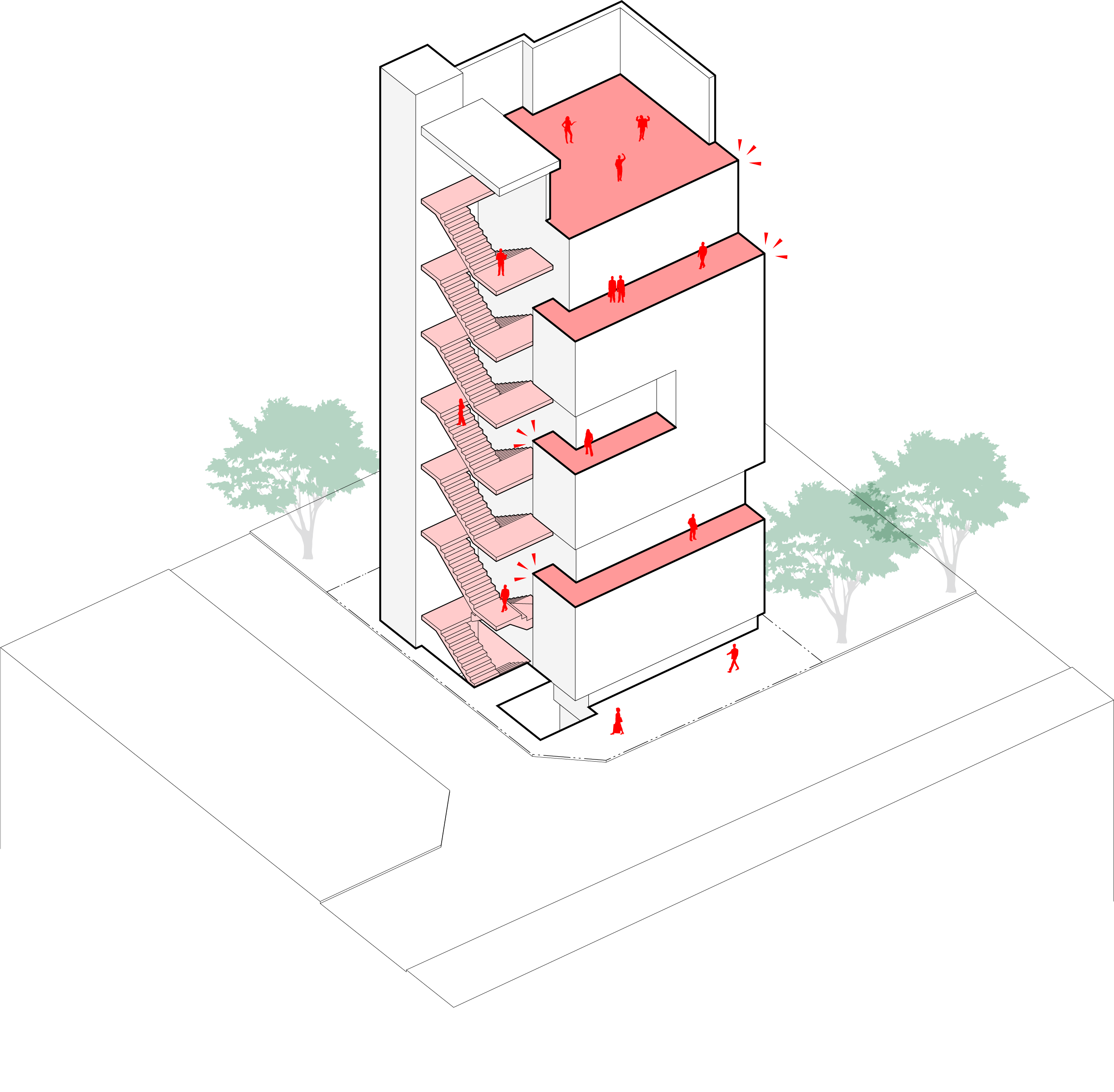 The basement level floats 1.2 meters above the ground floor, and corner triangle spaces are designed as sunken areas to ensure natural light and ventilation, creating a pleasant underground space. The ground floor mass is planned as a commercial space with a glass skin facade to facilitate natural interaction between the interior and exterior. From the second to the sixth floors, the spaces are designed for office use, with balconies on each floor to improve the working environment. These balconies allow for brief rest periods, enhancing work efficiency, while windows at the front and back ensure convenient natural ventilation for a comfortable workspace. Lastly, the rooftop floor is planned with movable partitions and beams to allow for a flexible roof design, considering the diverse activities of the occupants.