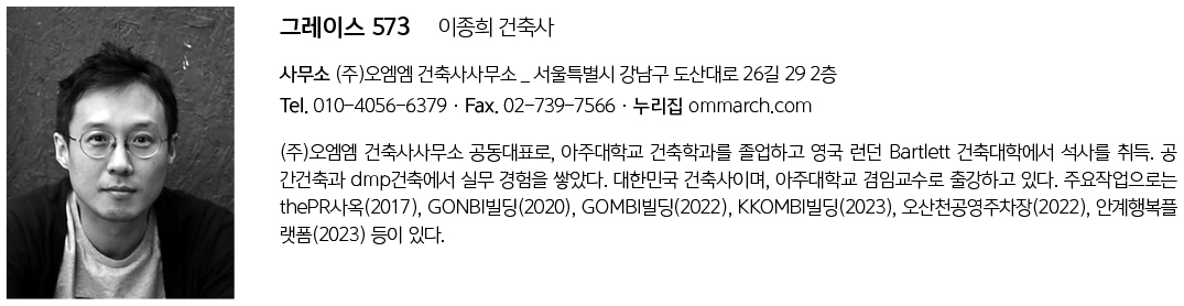 | 그레이스 573 설계자 | 김원영 · 박남규 · 이종희 _ (주)오엠엠 건축사사무소 건축주 | 여인주, 이강원, 이시은 감리자 | (주)오엠엠 건축사사무소 시공사 | (주)바우씨앤씨 설계팀 | 배지훈, 이창훈 설계의도 구현 | (주)오엠엠 건축사사무소 대지위치 | 서울특별시 강남구 논현로131길 43 주요용도 | 근린생활시설 대지면적 | 194.30㎡ 건축면적 | 96.77㎡ 연면적 | 589.25㎡ 건폐율 | 49.80% 용적률 | 248.83% 규모 | B1F - 7F 구조 | 철근콘크리트구조 외부마감재 | 벽돌타일 (유.다다벽돌 : 모노클래식타일DS 그레이) 내부마감재 | 노출콘크리트 설계기간 | 2021. 10 - 2022. 01 공사기간 | 2022. 03 - 2023. 07 사진 | 김창묵 구조분야 | 프라임구조 기계설비분야 | (주)정연엔지니어링 전기분야 | (주)정연엔지니어링 소방분야 | (주)정연엔지니어링 |