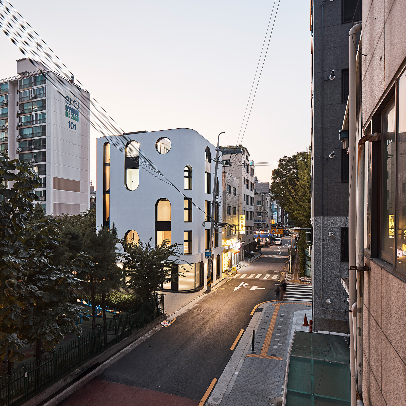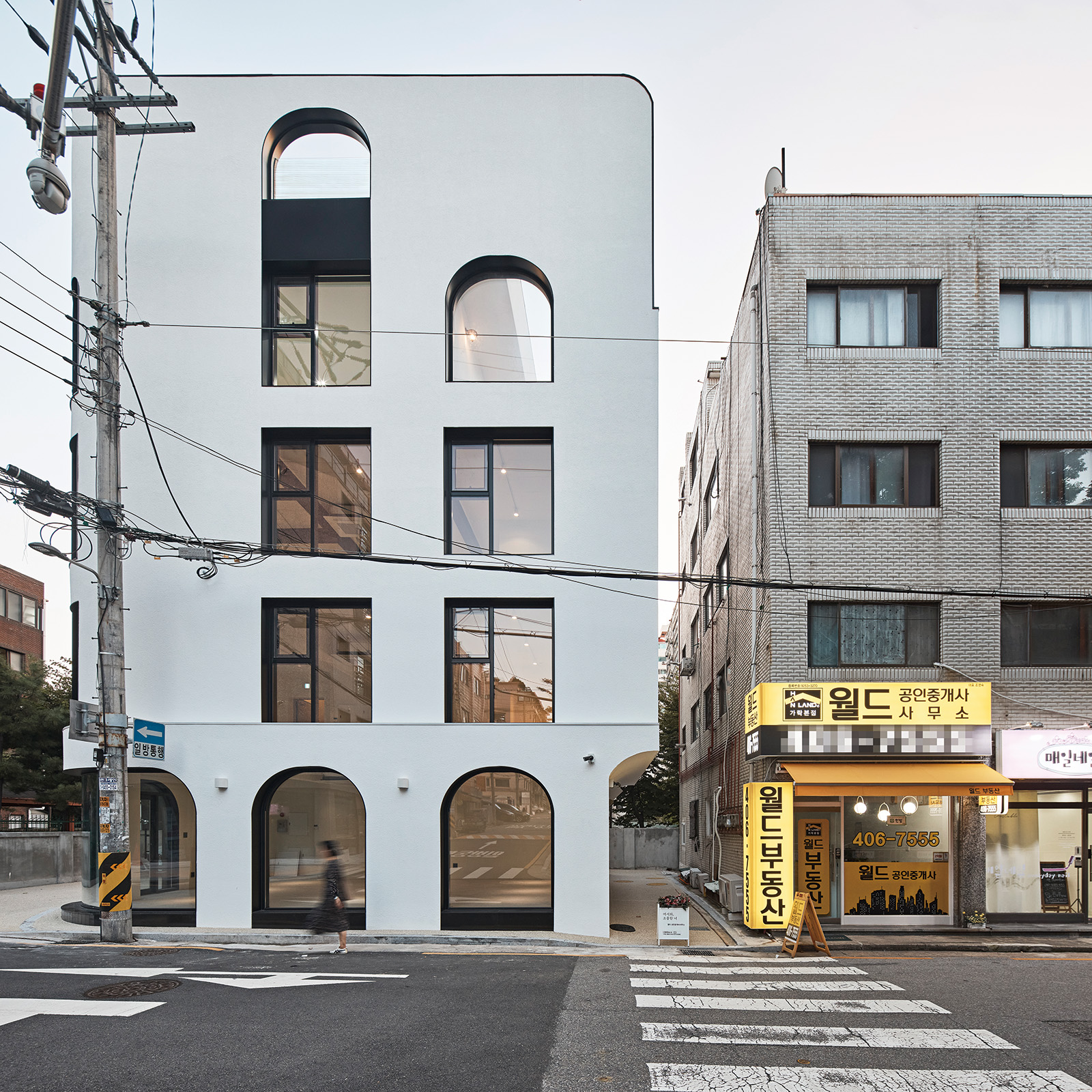 설계 초기 건축주가 강력하게 제시한 아이디어는 ‘아치’였다. 모든 입면에 아치로 된 창을 구성하길 원했지만, 아치만으로 모든 입면의 서로 다른 성격을 구현하는 데는 무리가 있었다. 그래서 각각의 입면을 다르게 보이도록 하기 위해 아치와 사각형을 조합해 다양한 표현을 시도했다. 사각형으로 강력한 구조와 안정성을 부여하고, 곡선으로 유연하고 유기적인 미적 감각을 더했다. 메인 입면인 남측은 아치를 높은 비율로 사용해 메인 가로의 다른 건물들과 대비감을 강조하여 건물의 가시성을 극대화했다. 동측은 학교는 물론 생활가로의 마지막 부분과도 맞닿아 있어 주로 사각형의 창을 통해 생활가로의 건물들과 조화를 이루면서 건물의 상층부에만 아치를 적용해 은은한 포인트를 주었다. 이처럼 서로 다른 입면의 모습은 자칫 지루할 수 있는 평면적 건물에 입체적 성격을 부여하고, 그로 인해 도시에 활력을 불어넣어 주는 역할을 한다.