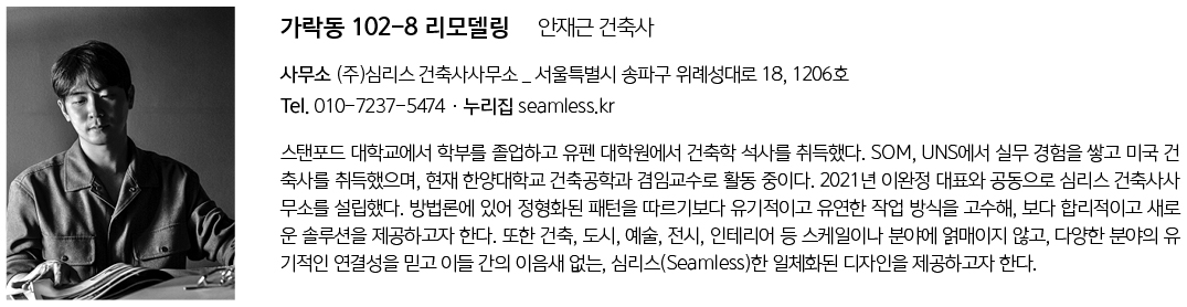 | 가락동 102-8 리모델링 설계자 | 안재근 _ (주)심리스 건축사사무소 건축주 | (주)애니클로 시공사 | (주)위성종합건설 대지위치 | 서울특별시 송파구 주요용도 | 근린생활시설 대지면적 | 177㎡ 건축면적 | 97㎡ 연면적 | 451㎡ 건폐율 | 55% 용적률 | 184% 규모 | 5F 구조 | 철근콘크리트구조, 시멘트 벽돌구조 마감재 | Sto 설계기간 | 4개월 공사기간 | 3개월 사진 | 이남선 |