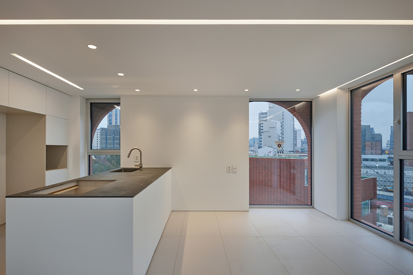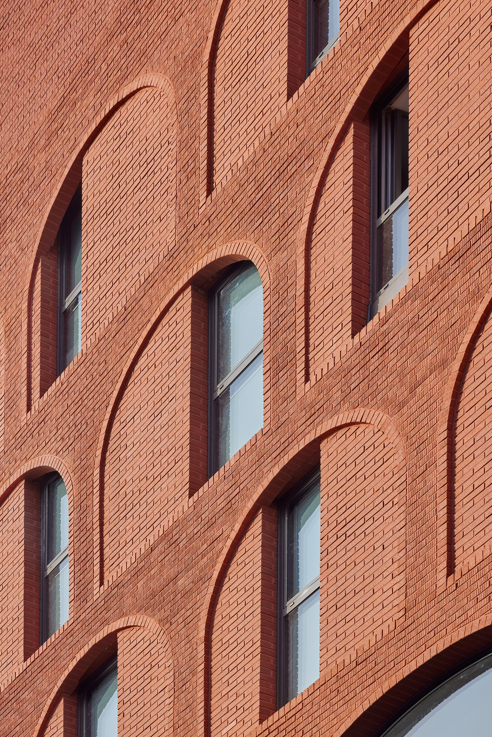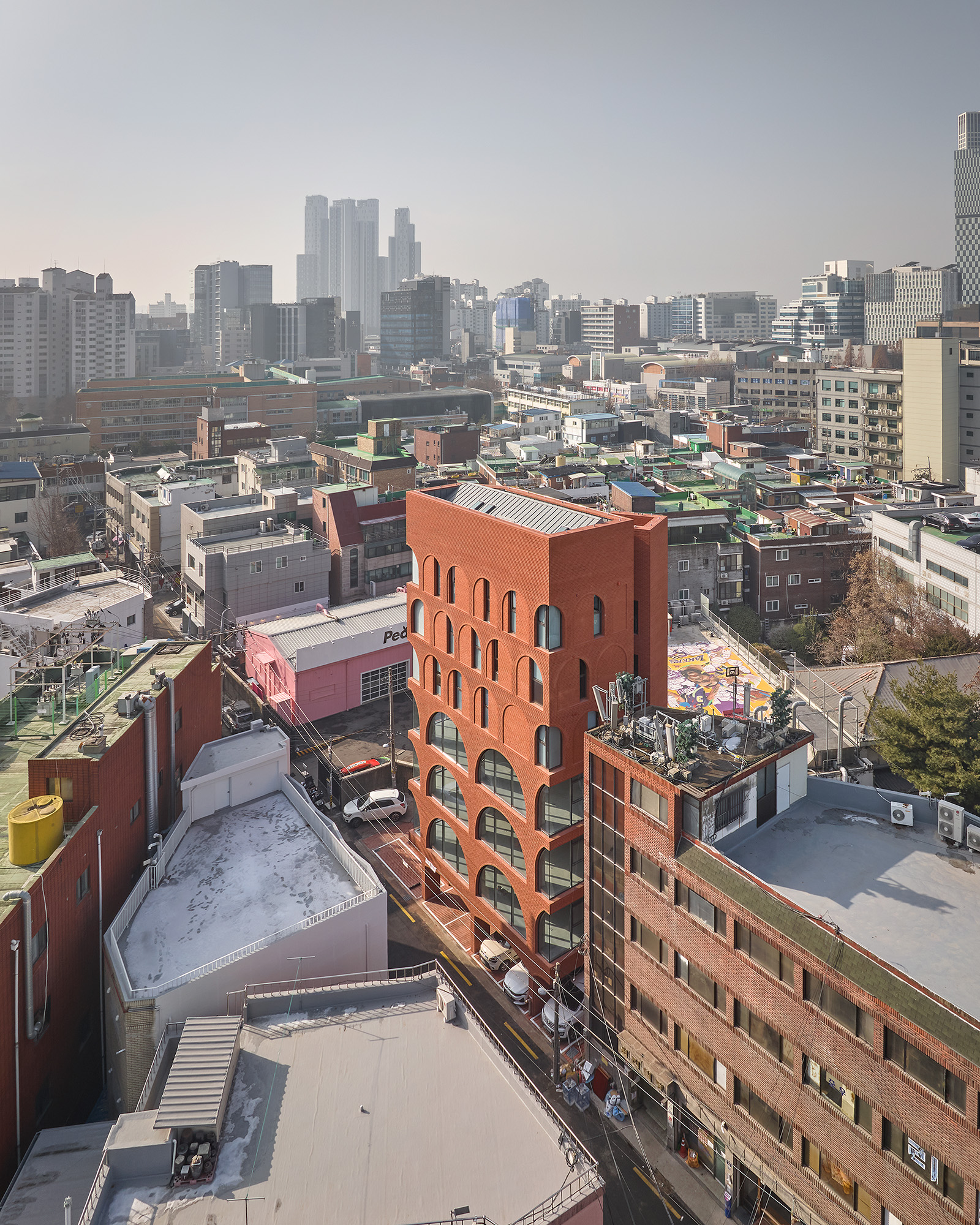 Seongsu-dong is a tapestry of industrial, commercial, and residential buildings accumulated over time, currently experiencing an overload of urban landscape due to the influx of unique commercial spaces attracted by the area’s vibrant community. Philome Building adds to this environment with its mix of commercial spaces and diverse residential types, including rental studios and two different types of owner-occupied residences. The goal was to simplify the complexity created by diversity, introducing a margin in the saturated urban landscape. The building’s design harmonizes around the motif of arches, tailored to the programmatic needs, using common Seongsu-dong red bricks and contrasting fine details with two different textures to create distinction within simplicity.