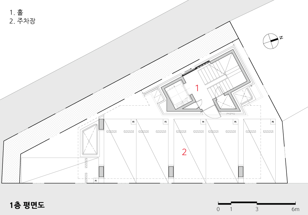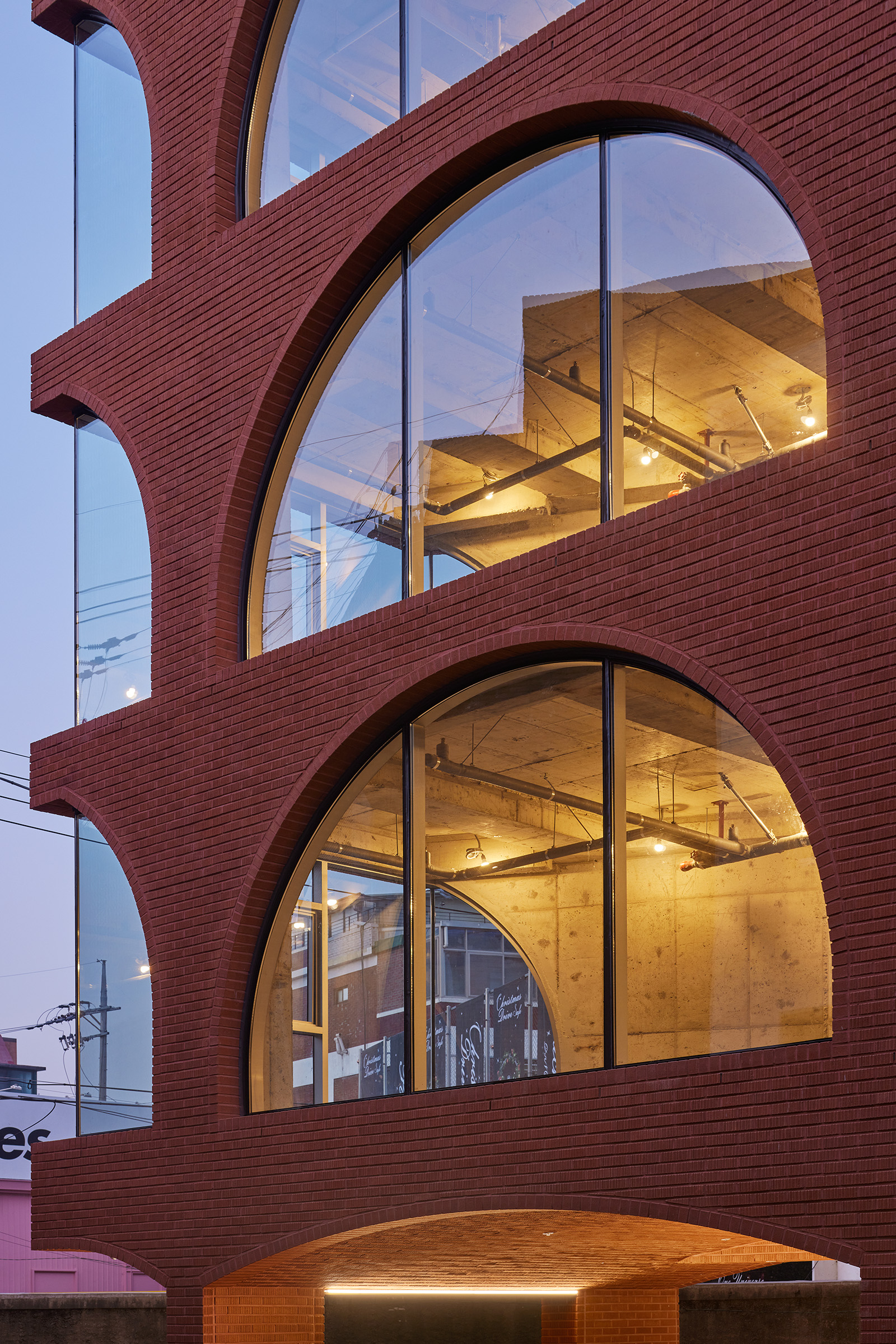 좁은 대지의 1층은 계단실을 제외한 대부분이 법정 주차로 채워진다. 모든 소규모 건물들의 1층이 필로티 구조가 될 수밖에 없는 태생적 이유이다. 필로티의 기둥이 지상 7층의 거대한 구조물을 받치고 있는 건물에서 필로티 구조와 상부 건물의 이질적이지 않은 조화의 방식에 대한 고민이 중요한 프로젝트이다. 필로티 구조 건물과의 연결성을 탐색하는 과정에서 성수동 고가 구조물에서 착안하여 필로티를 두 개의 큰 아치 구조로 계획하고, 상부층은 그 구조에서 자라나 하나로 엮여 있는 입면을 계획했다. 필로티의 바닥 역시 붉은 벽돌로 마감해 땅에서 시작해 건물 전체가 유기적으로 연계되게 계획했다. 아치 형태의 필로티는 큰 도로에서 후면의 막혀있던 도로를 연결하는 새로운 가로 경험의 공간이 된다.