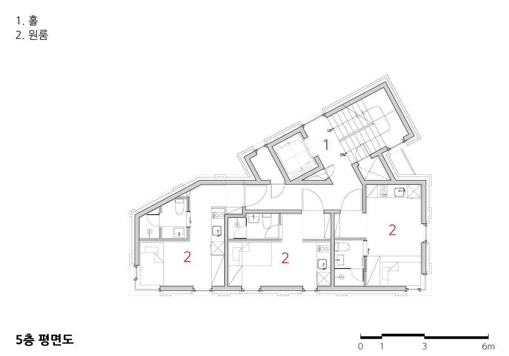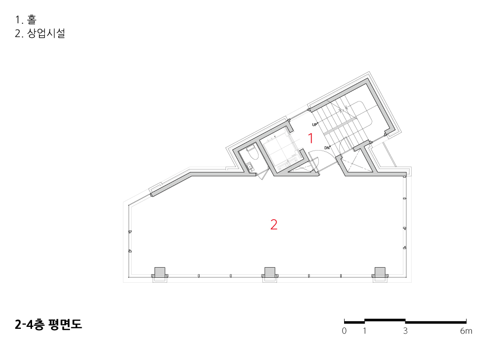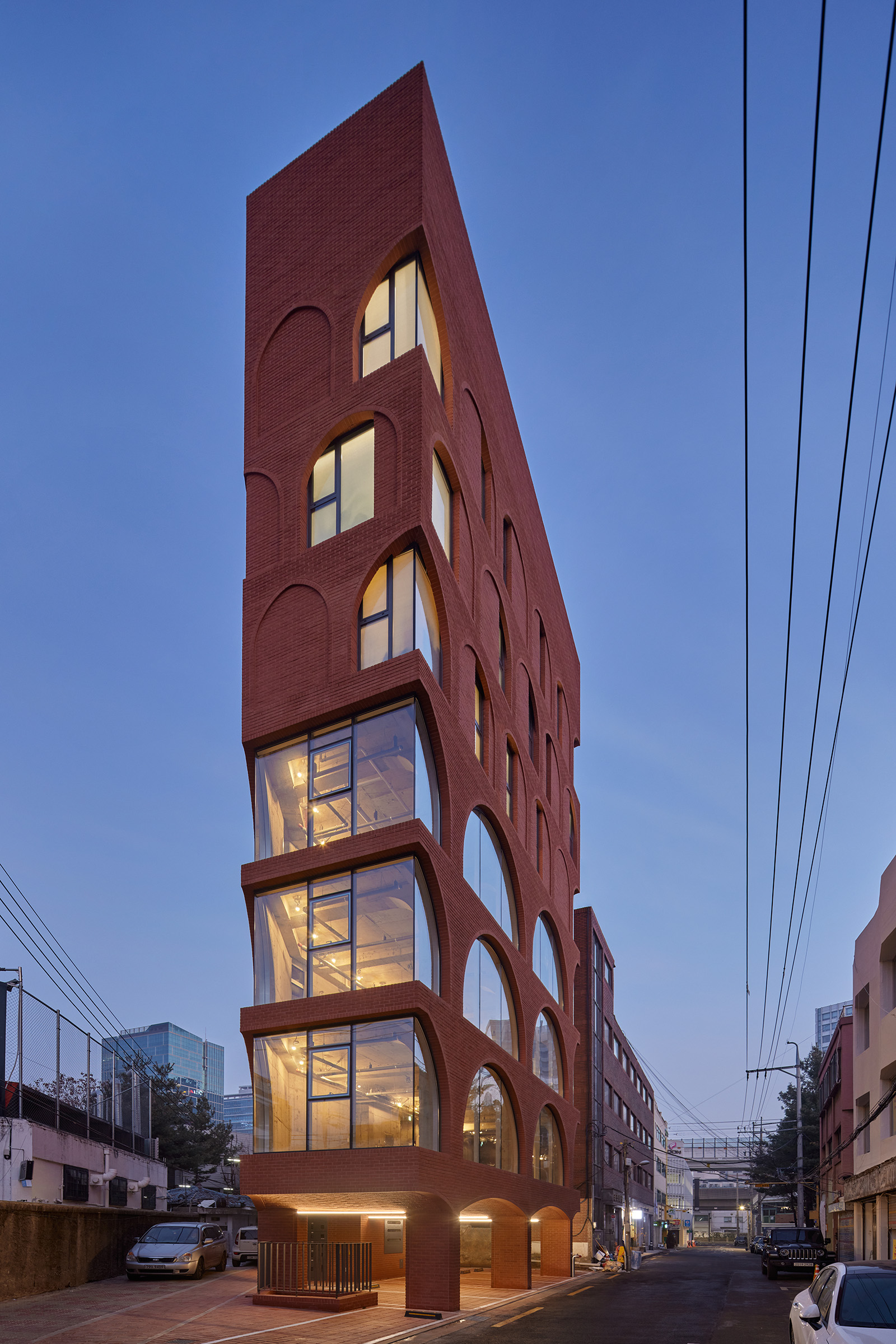 Due to the limited land, the ground floor, excluding the stairwell, is mostly dedicated to statutory parking, making pilotis a natural structural choice for small buildings. This project critically examines the harmony between the pilotis structure supporting seven stories above ground and the upper building, ensuring a seamless blend. Inspired by Seongsu-dong’s overpass structures, the pilotis was designed as two large arches, with the upper floors’ façade integrated as if growing from these structures. The pilotis floor was finished with red bricks, tying the building to the ground organically. This arch-shaped pilotis transforms into a new pedestrian experience, linking the major road to previously inaccessible back streets.