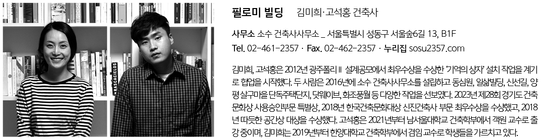 | 필로미 빌딩 설계자 | 김미희 · 고석홍 _ 소수 건축사사무소 건축주 | 비공개 감리자 | 소수 건축사사무소 시공사 | (주)쓰리스퀘어 종합건설 설계팀 | 황예슬, 김병준 대지위치 | 서울특별시 성동구 성수동2가 주요용도 | 근린생활시설, 다가구주택 대지면적 | 142.57㎡ 건축면적 | 85.52㎡ 연면적 | 587.23㎡ 건폐율 | 59.98% 용적률 | 351.80% 규모 | B1F - 7F 구조 | 철근콘크리트구조 외부마감재 | 치장벽돌쌓기 내부마감재 | 바닥 - 콘크리트 폴리싱 위 표면강화제 벽·천장 - 석고보드 위 지정 도장 설계기간 | 2020. 10 – 2021. 08 공사기간 | 2021. 09 – 2022. 12 사진 | 노경 구조분야 | 한길구조엔지니어링 기계설비분야 | (주)건양엠이씨 전기분야 | (주)극동파워테크 소방분야 | (주)삼우엠이씨 |