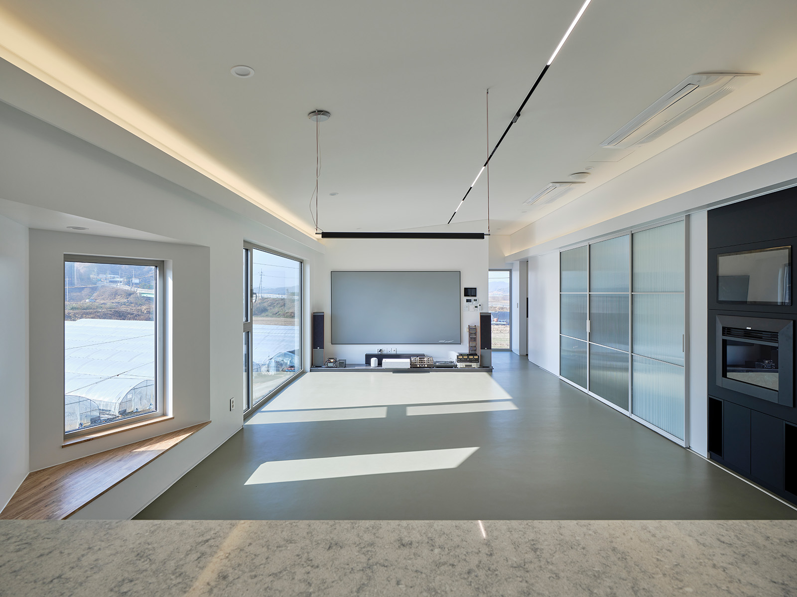 교외의 전원주택은 많은 이들이 꿈꾸는 주거 방식이지만, 막상 지어보면 현실적인 어려움이 다수 존재한다. 그중에서도 건물과 관련된 부분으로 보자면, 높은 공사비와 유지관리의 어려움을 들 수 있다. 현장 제작 방식의 비중이 전통적으로 높은 국내 건설업에서는 비용 관리의 개선과 공사비의 효율적인 산정이 여전히 어려운 편이다. 본 프로젝트에서는 북미식 경골 목구조를 토대로 하여, 효율적인 공사비 산정을 위해 극대화된 박스 형태와 외쪽 경사지붕을 도입함으로써 형태와 구법, 비용 산정에 있어 ‘의도적인 심플함’을 계획했다. 결과적으로 유지관리에도 용이하면서, 동일 규모와 스펙의 콘크리트 건축물에 비해 70~80%의 비용으로 건물을 완공할 수 있었다.