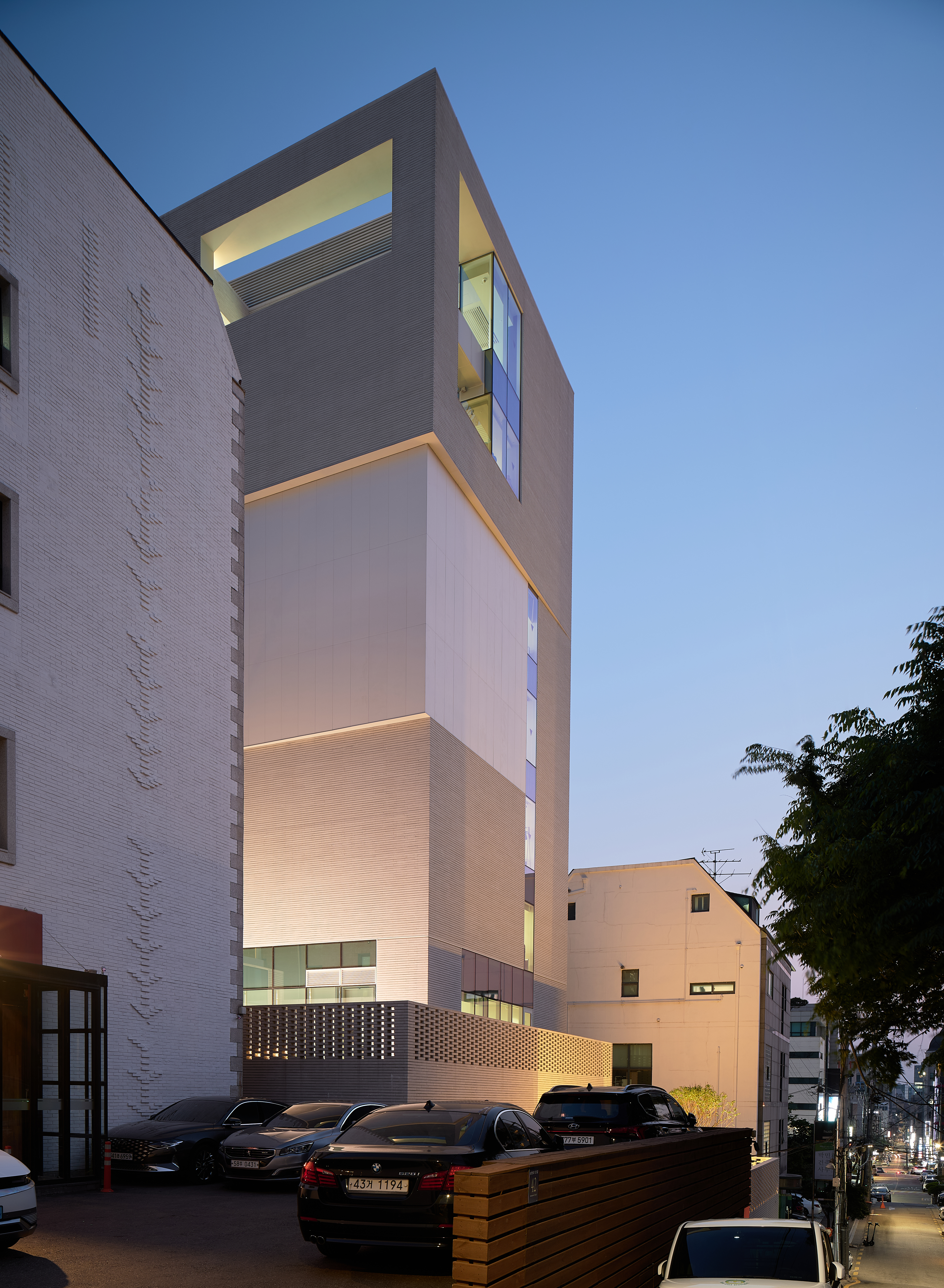 박일훈_ 말씀대로, 대지의 규모를 검토하고 디자인 요소를 반영하는 과정에서 정북방향일조사선에 어떻게 대응할지가 큰 설계주안점 중에 하나였습니다. 정북 방향으로 맞춰서 일반적으로 작업하다 보면 계단식으로 최대한 저층을 많이 채우게 되어 이런 높은 비례의 건물은 나오지 않았을 거라고 생각합니다. 일반적으로 도시에서 많이 볼 수 있는, 사선제한 선을 피해 저층부에서 계단식으로 풀어낸 매스 구성이 기능적으로나 경제적으로 유리한 부분이 있는 게 사실입니다. 하지만 광고회사 사옥으로서 이면도로에 위치하지만 학동로라는 대로에서의 인지성도 중요했기에 수직적 비례를 높이면서 저층부와 고층부의 매스를 구분하는 방향을 선택했습니다.