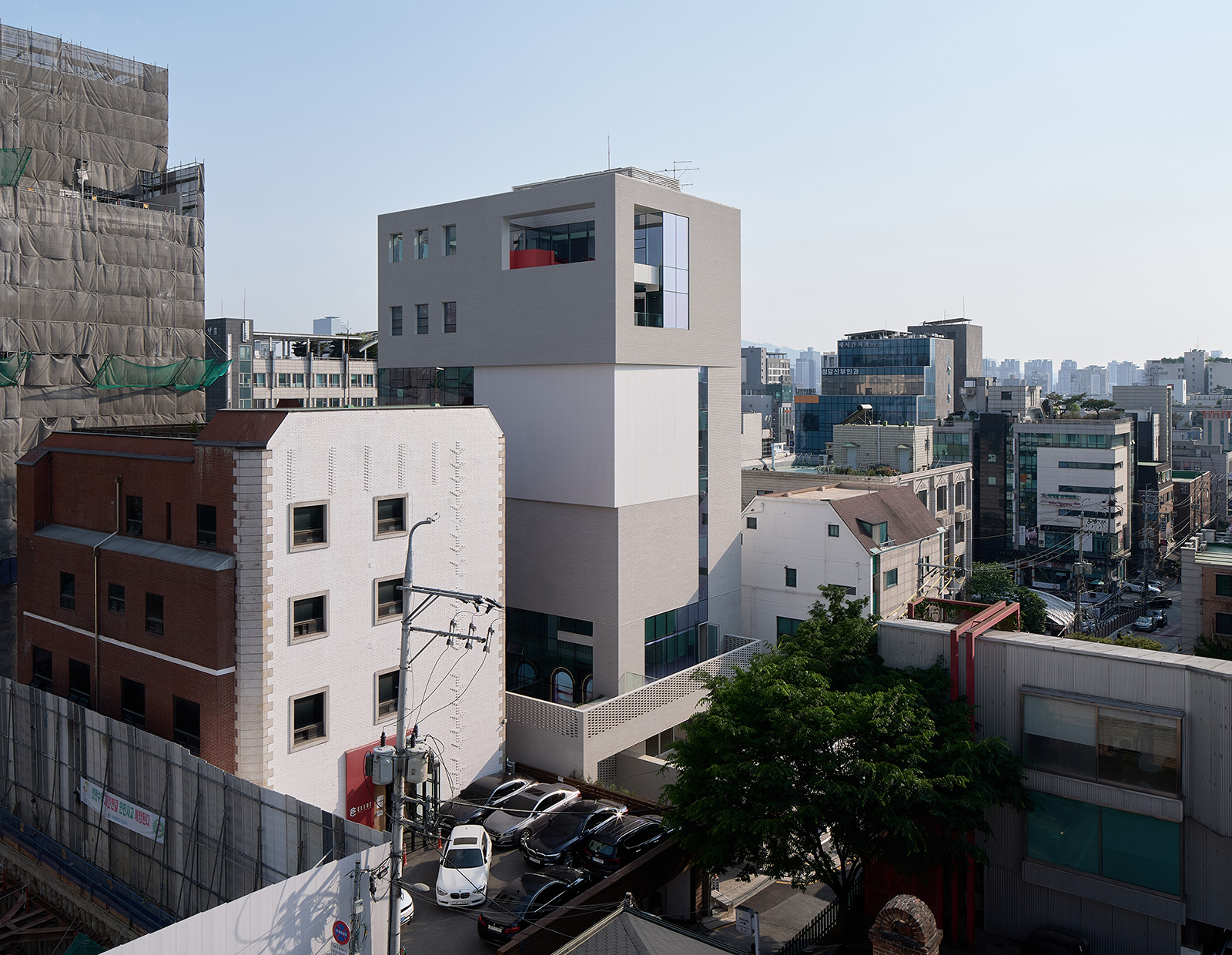저층부의 상대적 비움이 재료의 공법으로 인한 장치였다면, 고층부의 형태는 다소 과감하다. 2개 층마다 엮은 매스는 가로 방향의 모서리 부분을 과감히 셋백(Set back) 하여 지루한 입면을 벗어나고자 했다. 구조적, 기능적으로 불리하지 않되 입면의 변화를 이끌만한 요소를 모색하고 이에 심미적으로 만족할 만한 간격을 찾기 위해 고심한 흔적이 드러나는 부분이다. 모서리를 중심으로 방사되는 깊이의 변화로 인해 재료의 색상과 재질은 자연스럽게 구분되고, 이러한 입면의 패턴은 내·외부에서 특별한 풍경을 만든다. 입면의 미묘한 어긋남과 그 깊이가 만들어낸 이 풍경은 단조로운 빌딩 형태를 거부하고 익숙한 거리 속 낯선 풍경을 마주하게 해주는 시각적 장치 역할을 한다.
