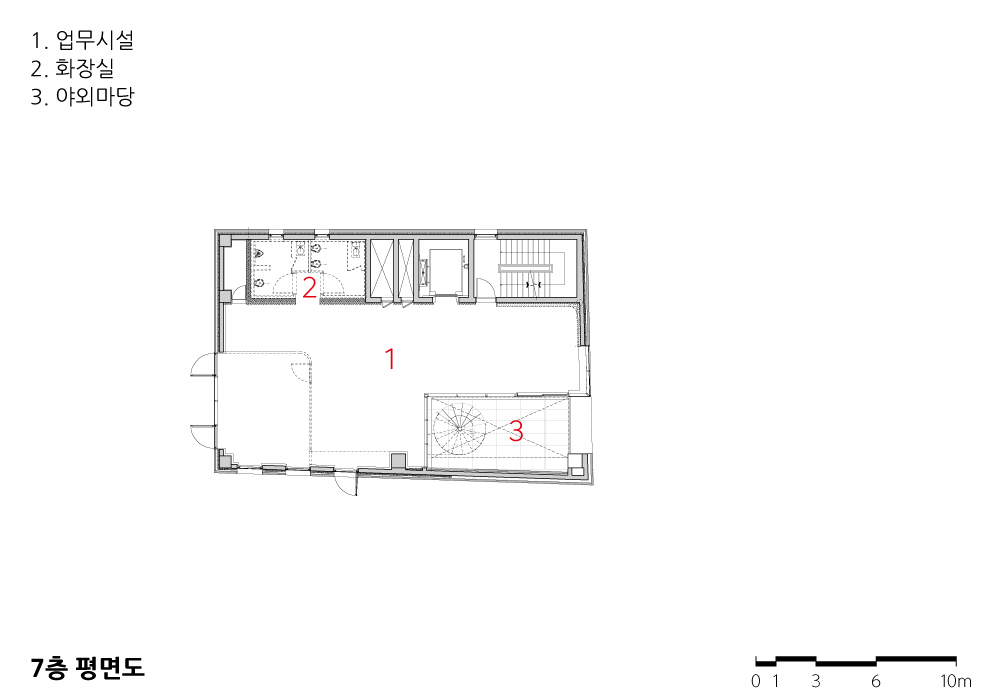 외부공간들은 수직적으로 올라가며 공공성의 위계를 갖는데, 사옥을 찾는 고객을 위해 저층부는 최대한 개방되게 계획하고, 최상부층으로 갈수록 업무 또는 직원 휴게를 위한 공간으로 활용될 수 있도록 하여 동선의 위계에 따라 외부공간의 성격은 물론 개방성에도 차이를 두었다.