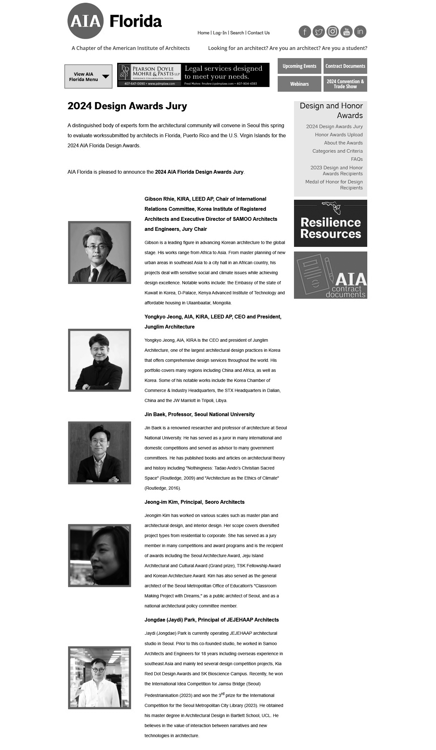 올해 미국건축사협회(AIA) 플로리다주 주최로 열리는 ‘2024 AIA 플로리다 디자인 어워드’의 심사가 특별히 서울에서 진행된다. 대한건축사협회 국제위원장 이건섭 건축사를 비롯한 대한민국 건축사들이 심사위원으로 참여하게 된다.