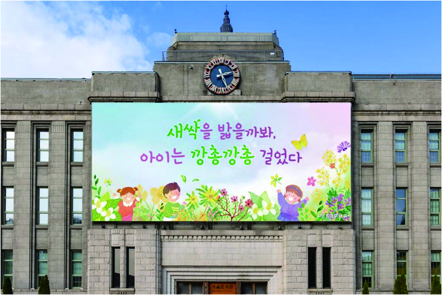 뭐지? 저렇게 순한 문장은? 새싹을 밟을까봐 조심하는 어린이라니, 게다가 살금살금 걷지 않고 봄 햇살이 주는 흥을 못 이겨서 깡총깡총 걸었다니! 쇼핑몰의 세일 행사를 알리는 것 같지는 않고, 왜 저런 문장을 걸었을까? 책상 앞에 앉아서도 그 짧은 문장이 머릿속을 떠나지 않았다. 검색해 보니 서울시가 2024년 봄을 맞아 ‘꿈새김판’에 게시한 글귀였다.