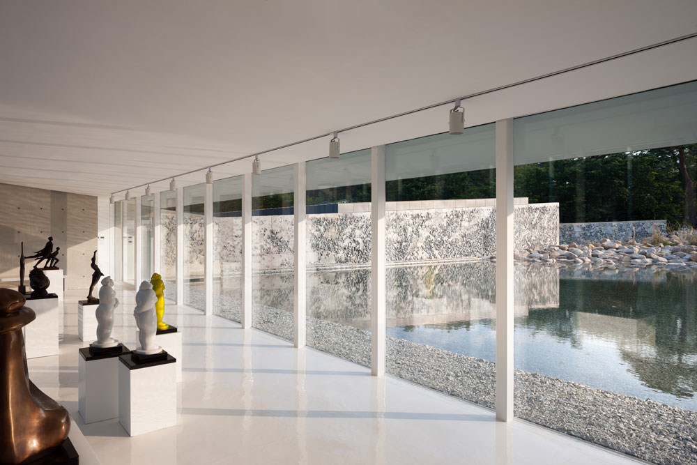 바우지움’은 조각가인 주인의 컬렉션이 상설 전시되는 ‘근현대조각관’과 자신의 작품전시와 작업 실을 겸하는 ‘김명숙조형관’ 그리고 특별전시와 큐레이터의 공간이 마련된 ‘별관’으로 이어진다. 10%의 건축으로 땅을 채우기 위해 펼친 공간은 모두 울산바위를 향한다. 비록 서향이지만 공간의 질서를 결정하는 항목에서 그것을 능가하는 조건은 따로 없다.