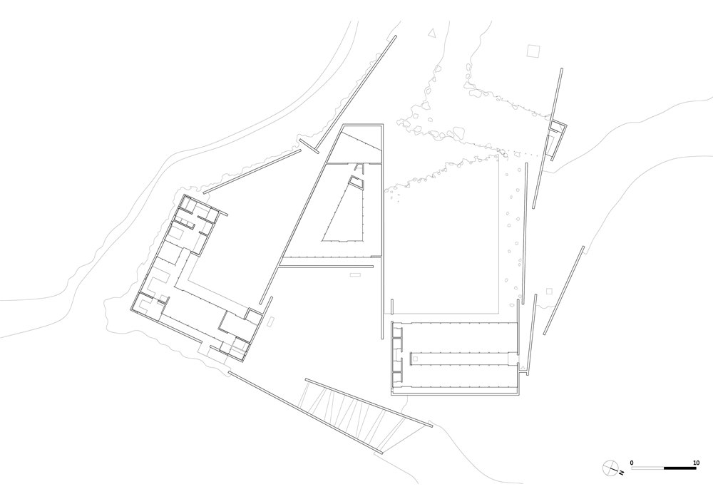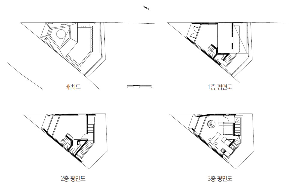 땅을 셋으로 나누고 물과 돌과 풀로 마당을 만들어 10년 넘게 가꾸어온 주인의 거주공간과 이어지 게 한다. 결국 넷의 영역이 만들어진다. 울타리-담은 공간을 일으키는 주제가 된다. 길이와 높이가 다른 담을 여럿 세우고 겹치고 꺾이는 곳에 지붕을 얹어 집을 꾸민다. 담의 어딘가에 지붕이 있을 뿐 건물의 형태는 따로 없다. 조형을 담을 공간에서 건축은 나서지 않는다.