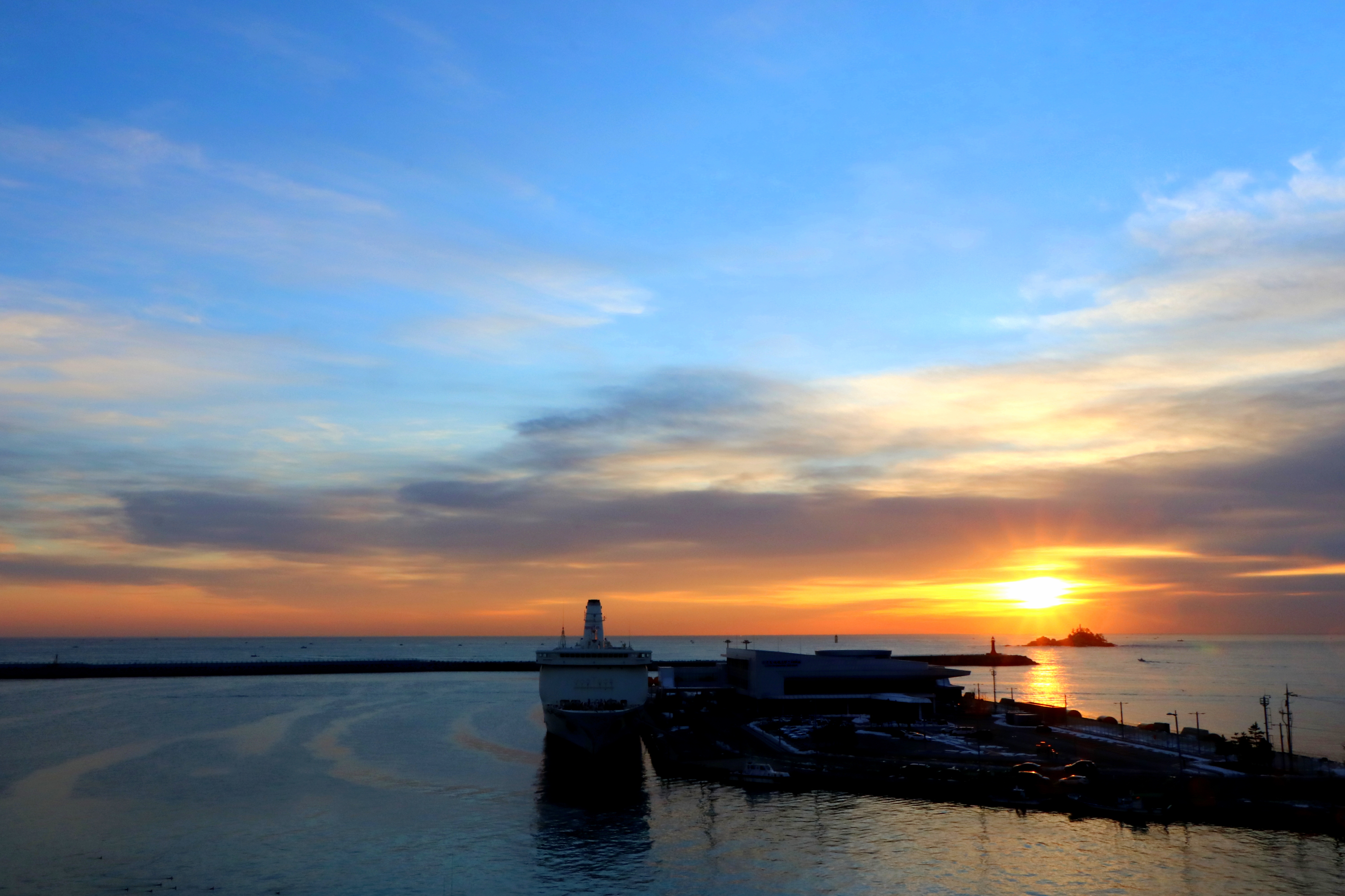 속초항에 정박되어 있는 크루즈선 뒤로 길을 밝혀주는 등대와 외로이 떠 있는 조도(鳥島) 넘어, 태양이 어둠을 걷어내고 얼굴을 내민다.