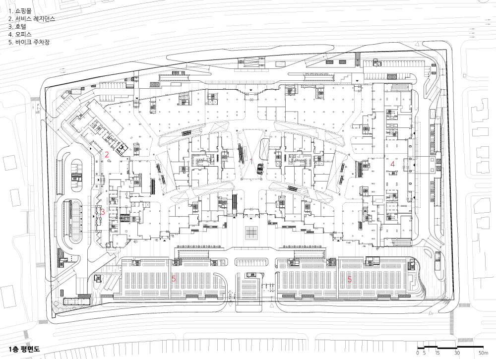 쇼핑몰은 1층부터 5층까지 위치하고 있다. 세 개의 천창을 통해 자연채광과 넓고 개방적인 공간감을 선사해 고객들에서 더 나은 환경과 경험을 제공하고 있으며, 중앙 천창 아래에는 2개 층을 가로지르는 익스프레스 에스컬레이터가 있어 2층에서 4층의 복합문화공간에 대한 접근성을 높이는 동시에 내부 브릿지와 같은 역할을 하고 있다.