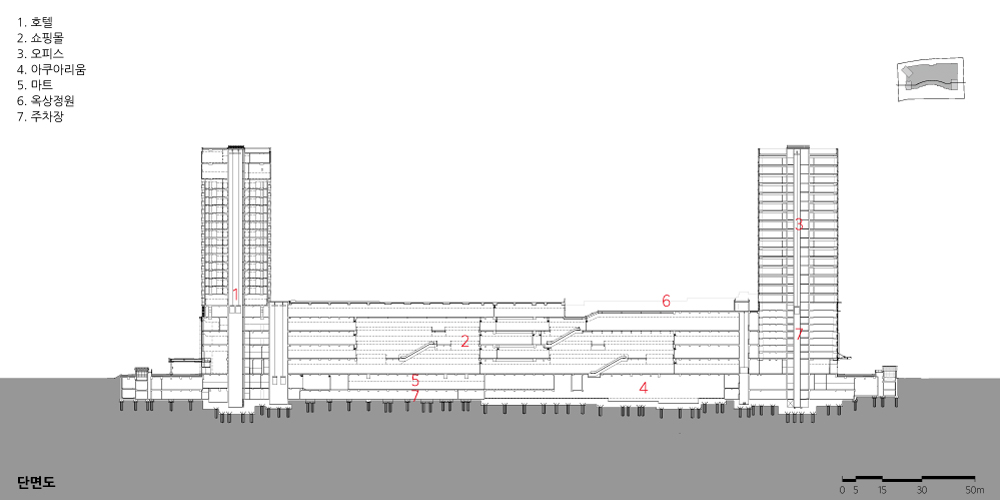 The podium houses a shopping mall, aquarium, mart, and cinema. It architecturally reinterprets the pedestrian access and the combination of narrow buildings typical of Vietnamese streets, giving it symbolic significance by dividing it into small scale mass assemblies. Terraces facing West Lake have been installed to ensure an open view. Conversely, the facade facing Yihuan Road, a car-only road, is designed to represent flowing water to overcome the monotony that comes from fast-moving cars and large mass units.