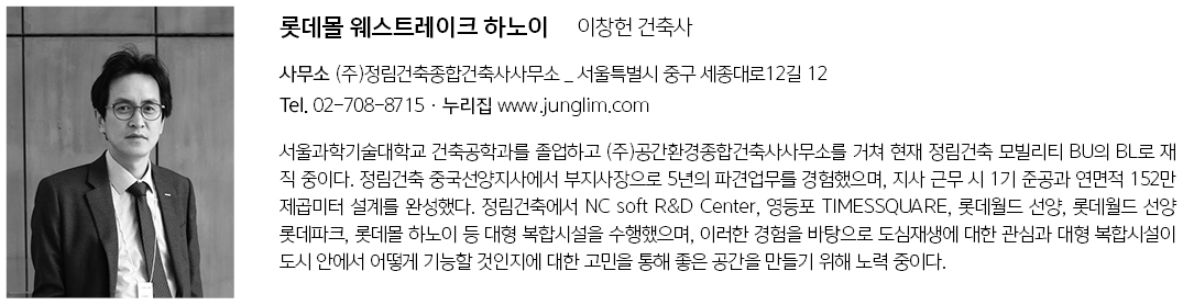 | 롯데몰 웨스트레이크 하노이 설계자 | 이창헌 _ (주)정림건축종합건축사사무소 공동설계 | Gregory Kovacs (ARB, MSc, AADip, ICOM, RIBA) / Benoy Jonathan van der Stel (BSc, MSc, RIBA, ARB, SBA) / Benoy 건축주 | LOTTE PROPERTIES HANOI Co., Ltd 감리자 | 4M partners 시공사 | 롯데건설 설계팀 | 윤하용, 김두현, 윤태웅, 강미주, 김동관, 김윤미, 김천심, 류지완, 박정규, 원은진, 윤설윤, 이남희, 이수진, 이재엽, 이창호, 정진아, 조영은, 최연민, 김채윤, 김성호, 김연관, 김경상, 김지훈, 박승, 이형철, 최승희, Nguyen Hue Thu, Tran Thi Thu Uyen 설계의도 구현 | (주)정림건축종합건축사사무소 대지위치 | PHU THUONG, HOTAY, HANOI, VIETNAM 주요용도 | 쇼핑몰, 업무시설, 호텔, 서비스레지던스 대지면적 | 73,409.20㎡ 건축면적 | 고층부 5,069.29㎡ / 저층부 36,455.16㎡ 연면적 | 353,751.11㎡ 건폐율 | 고층부 6.93% / 저층부 49.81% 용적률 | 326.19% 규모 | B2F - 23F 구조 | 철근콘크리트구조, 철골철근콘크리트구조, 철골구조 외부마감재 | 금속패널, 화강석 설계기간 | 2016. 11 - 2023. 08 공사기간 | 2019. 12 - 2023. 08 사진 | 윤준환 구조분야 | (주)아이스트 기계설비분야 | 비드이앤씨, (주)삼우엠이피컨설턴트, 전기분야 | (주)나라기술단 소방분야 | 한방유비스 주식회사, (주)한일엠이씨 |