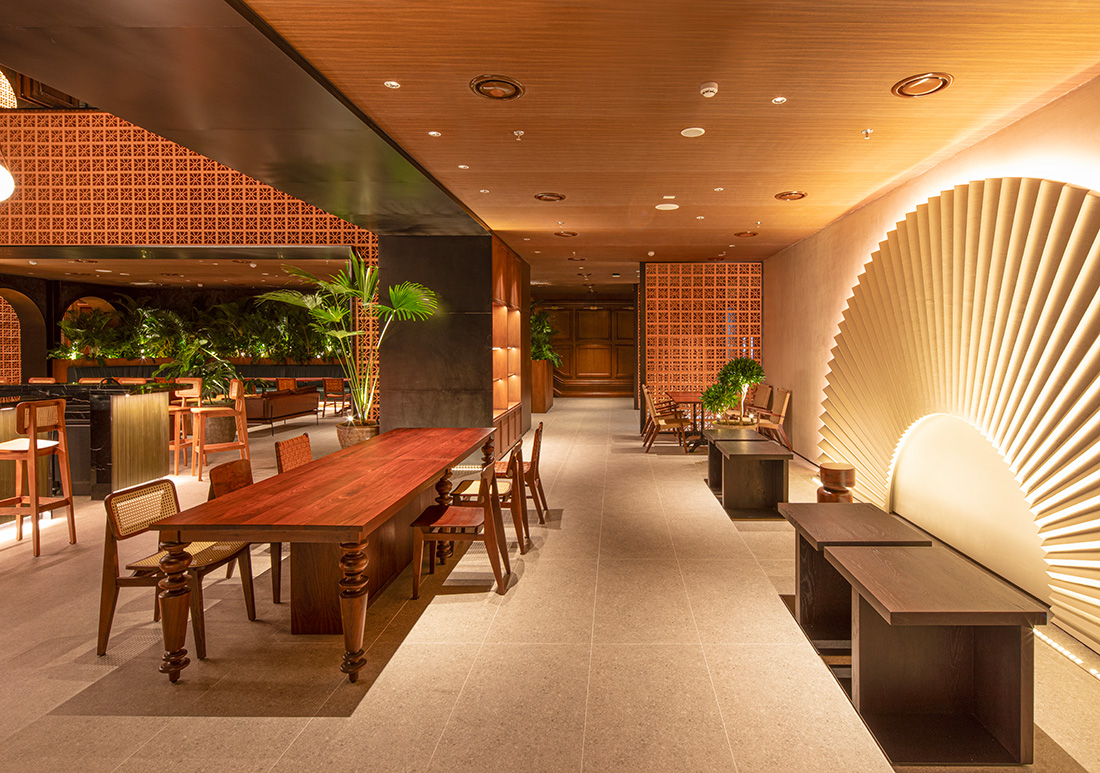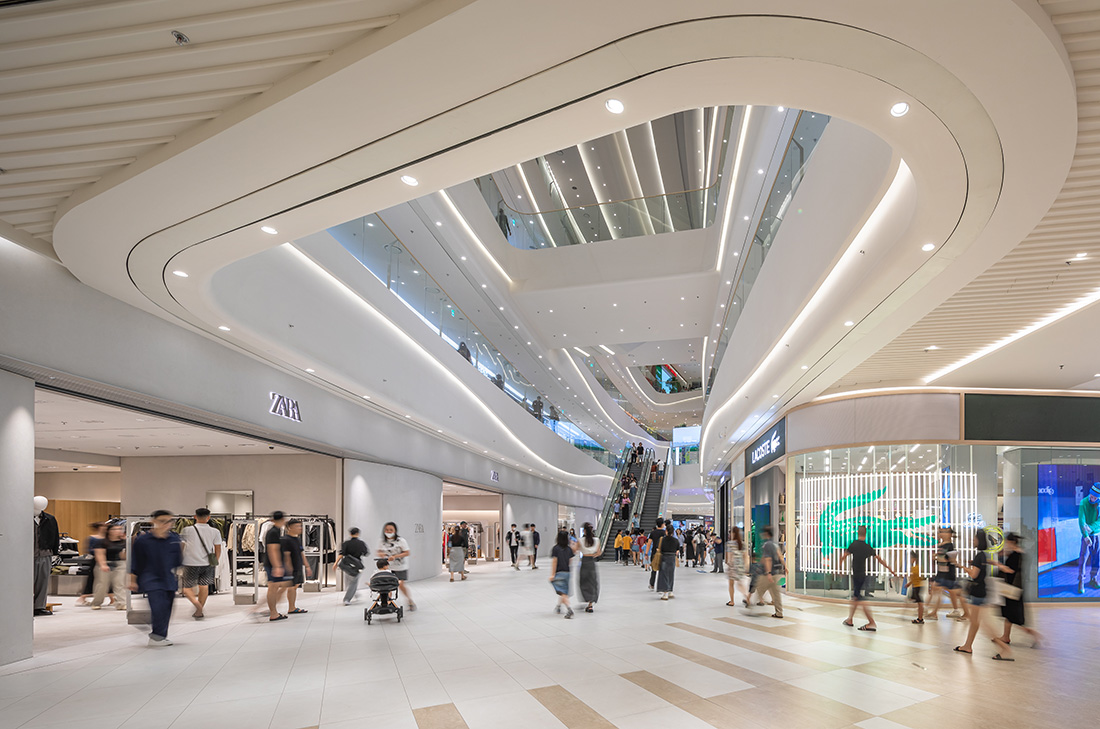 The shopping mall spans from the 1st to the 5th floor. It provides natural lighting and a spacious, open atmosphere through three skylights, enhancing the environment and experience for customers. Beneath the central skylight, there is an express escalator that crosses two floors, providing access from the 2nd to the 4th floor’s cultural complex space while simultaneously serving a role similar to an internal bridge.