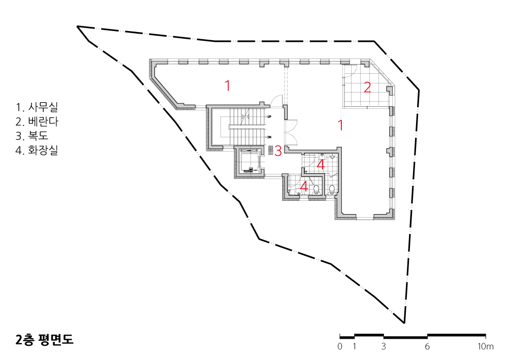 The shape of the site is very irregular like a triangle and aligns to the Korail’s railroad, on which the client cannot build. We proceed several design studies to maximize the area of the first level in relation to the surrounding environment and context. Among various architectural plans, we select a trapezoid formed plan, considered irregular parcel shape and functionality. The trapezoid mass sharp corner toward the subway station and wavy walls on the opposite side. To sum up, walls on the road side are very minimal and clear with wavy facade on the back street side, reacted to general people, satisfying functional and aesthetic architectural aspects.