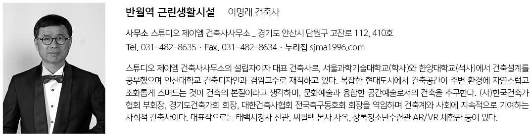 | 반월역 근린생활시설 설계자 | 이명래 _ 스튜디오 제이엠 건축사사무소 건축주 | 청주한씨 문간공하 참판공파 작악곡종중회 감리자 | 디딤 건축사사무소 시공사 | 그린종합건영(주) 설계팀 | 이용민, 김미희, 김홍중 설계의도 구현 | 스튜디오 제이엠 건축사사무소 대지위치 | 경기도 안산시 상록구 건건로 119-5 (건건동) 주요용도 | 제1종·제2종근린생활시설 대지면적 | 240.00㎡ 건축면적 | 116.26㎡ 연면적 | 329.04㎡ 건폐율 | 48.44% 용적률 | 137.10% 규모 | 3F 구조 | 철근콘크리트구조 외부마감재 | THK30 현무암 판석, THK24 로이복층유리 내부마감재 | 무석면비닐계타일(바닥), 친환경페인트(벽), 노출천장(천장) 설계기간 | 2021. 12 - 2022. 06 공사기간 | 2022. 08 - 2023. 03 사진 | 김한빛 구조분야 | 반석건축구조사무소 기계설비·전기·소방분야 | (주)정찬기술단 |